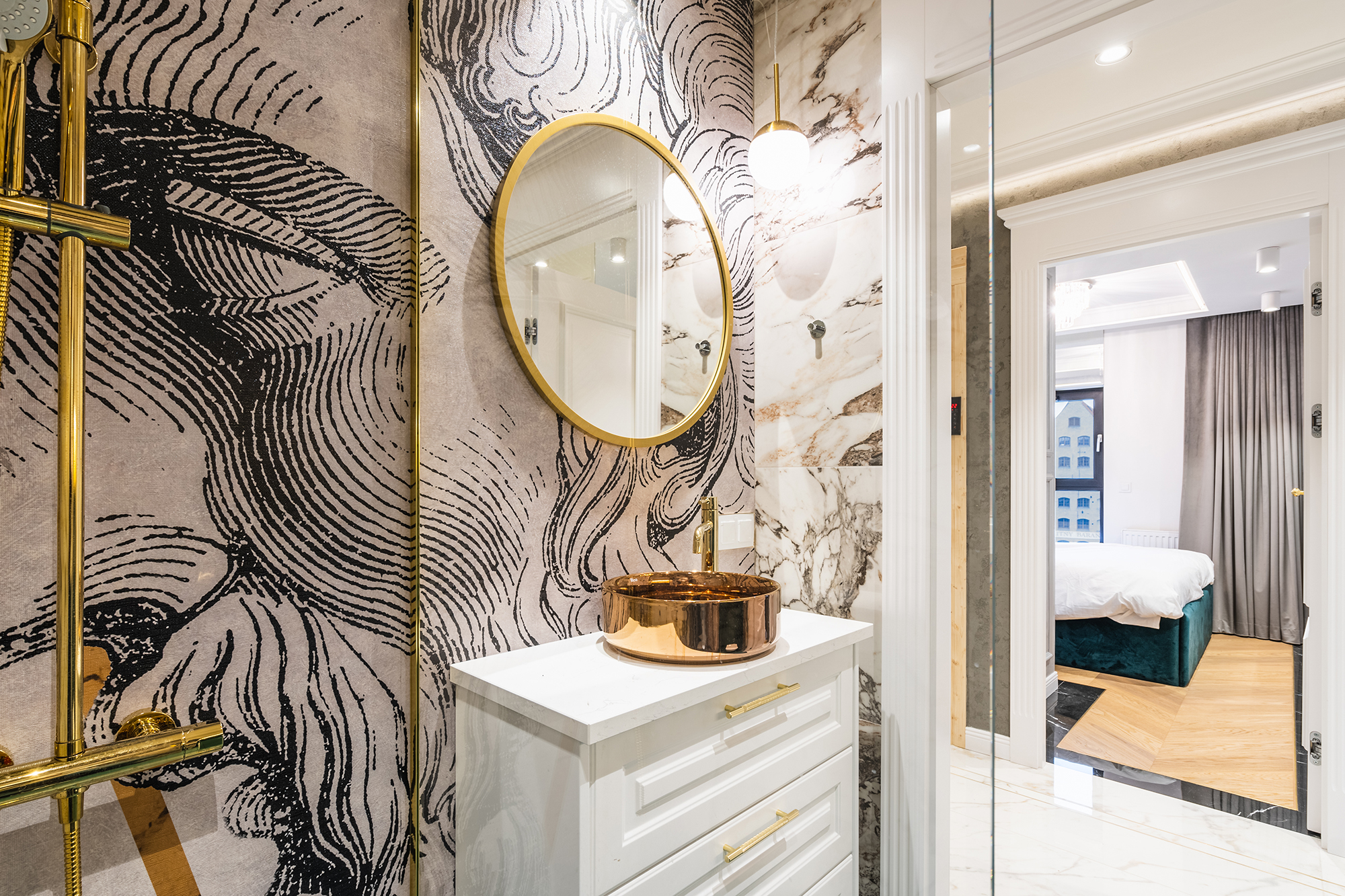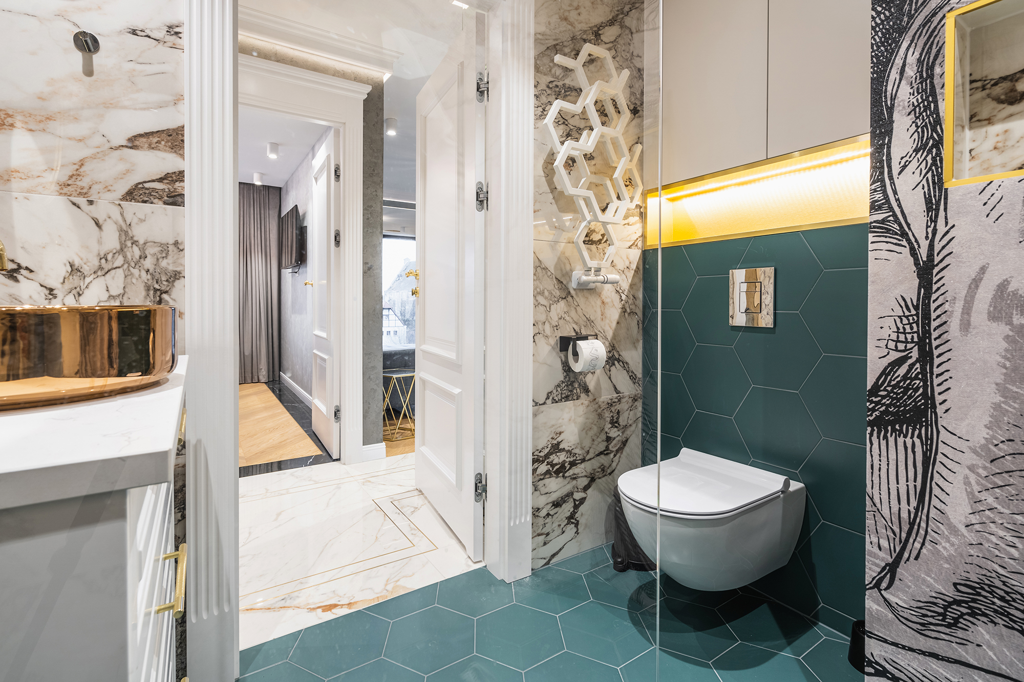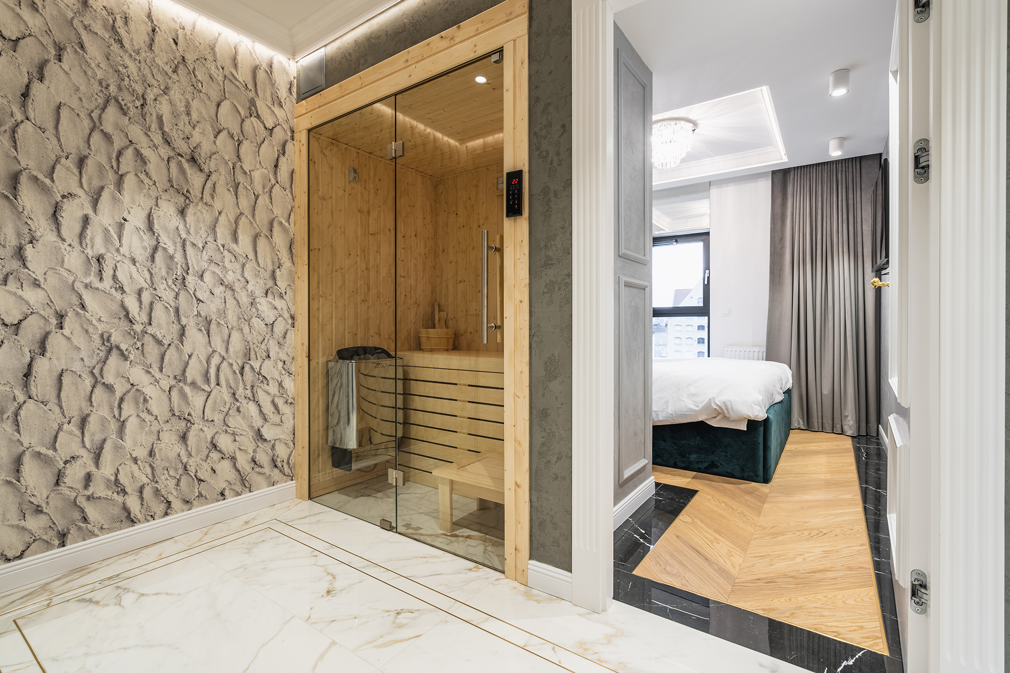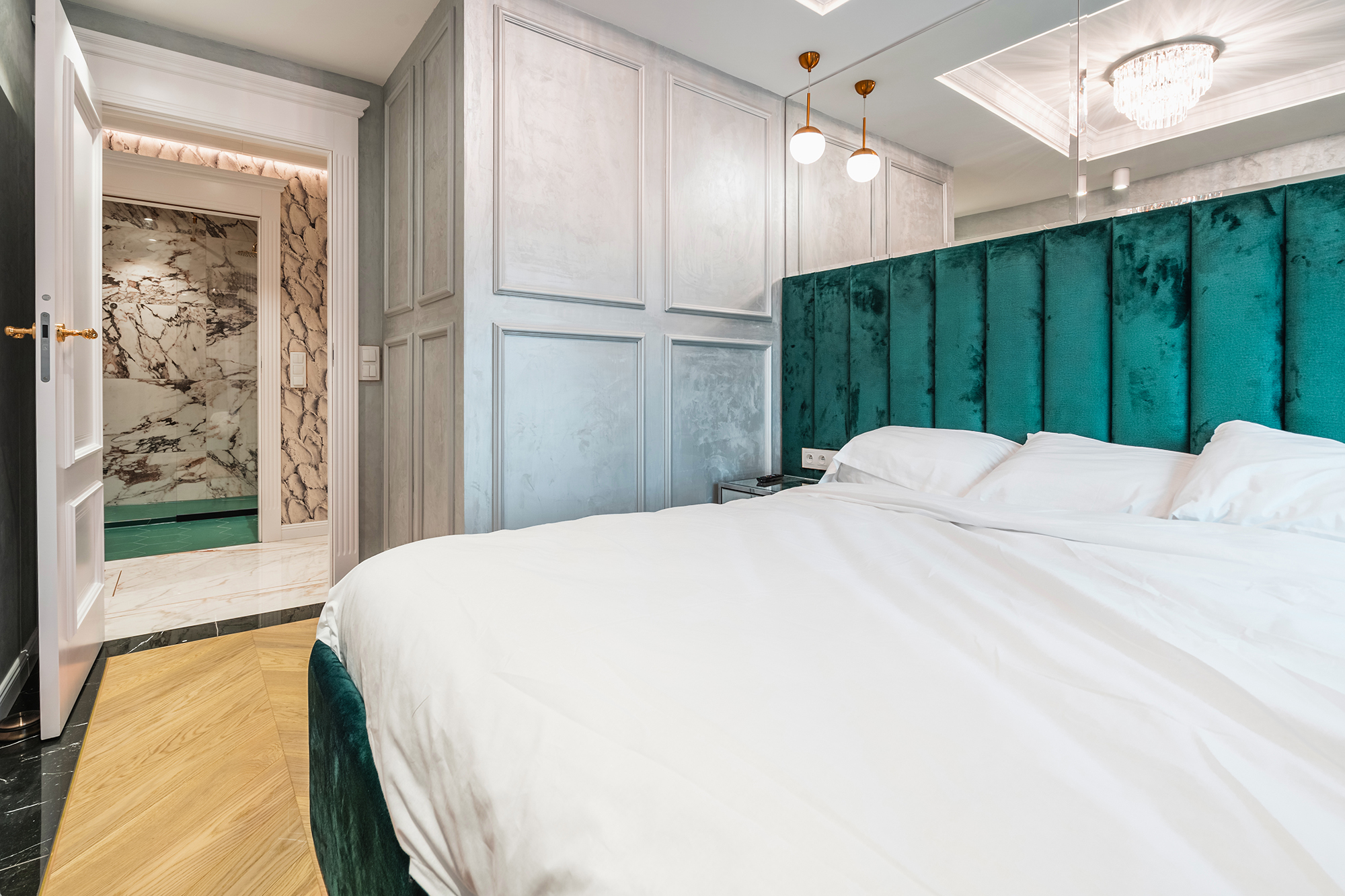controlled on a smartphone. We used marble tiles, wallpapers and mirrors to give the apartments an elegant character.