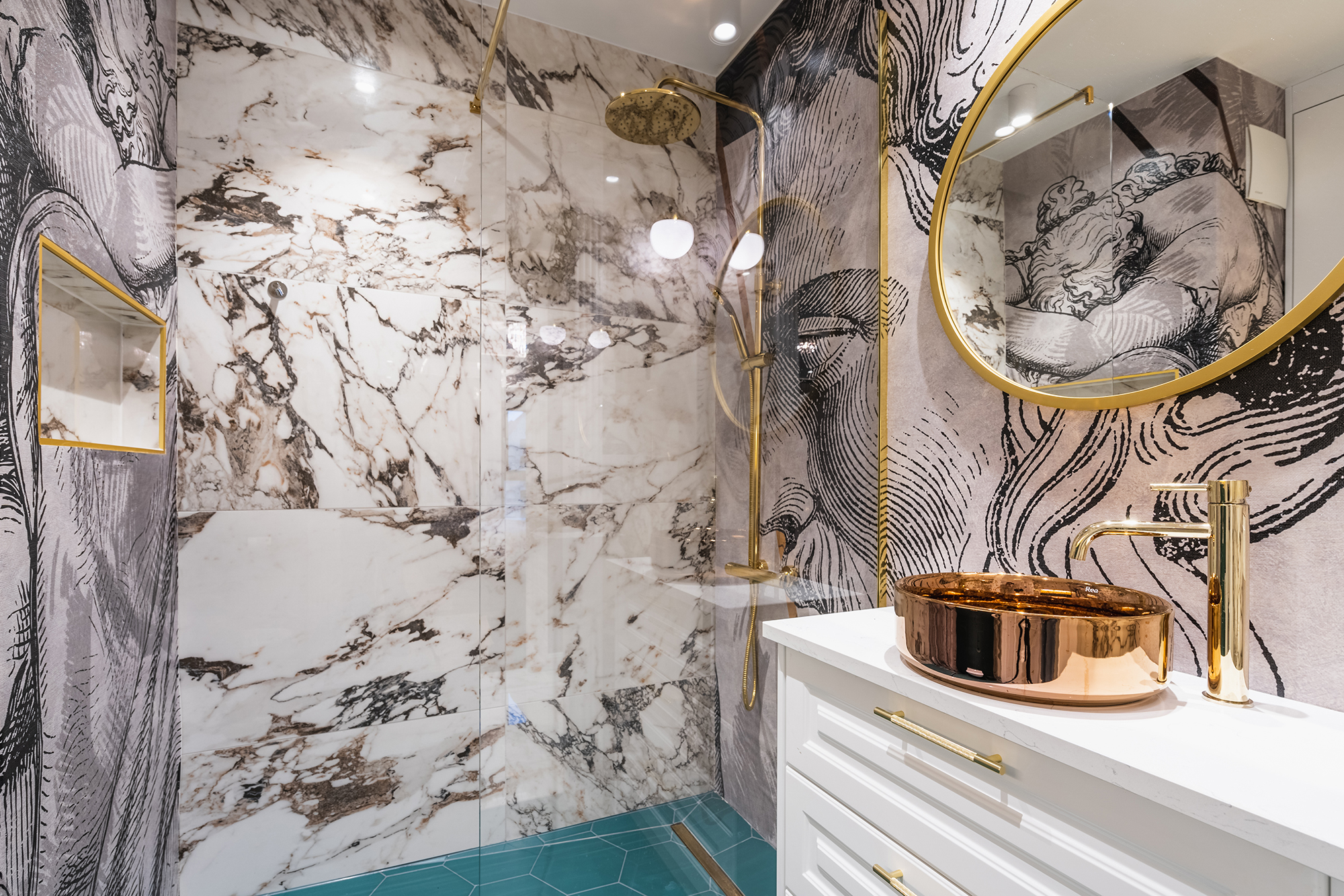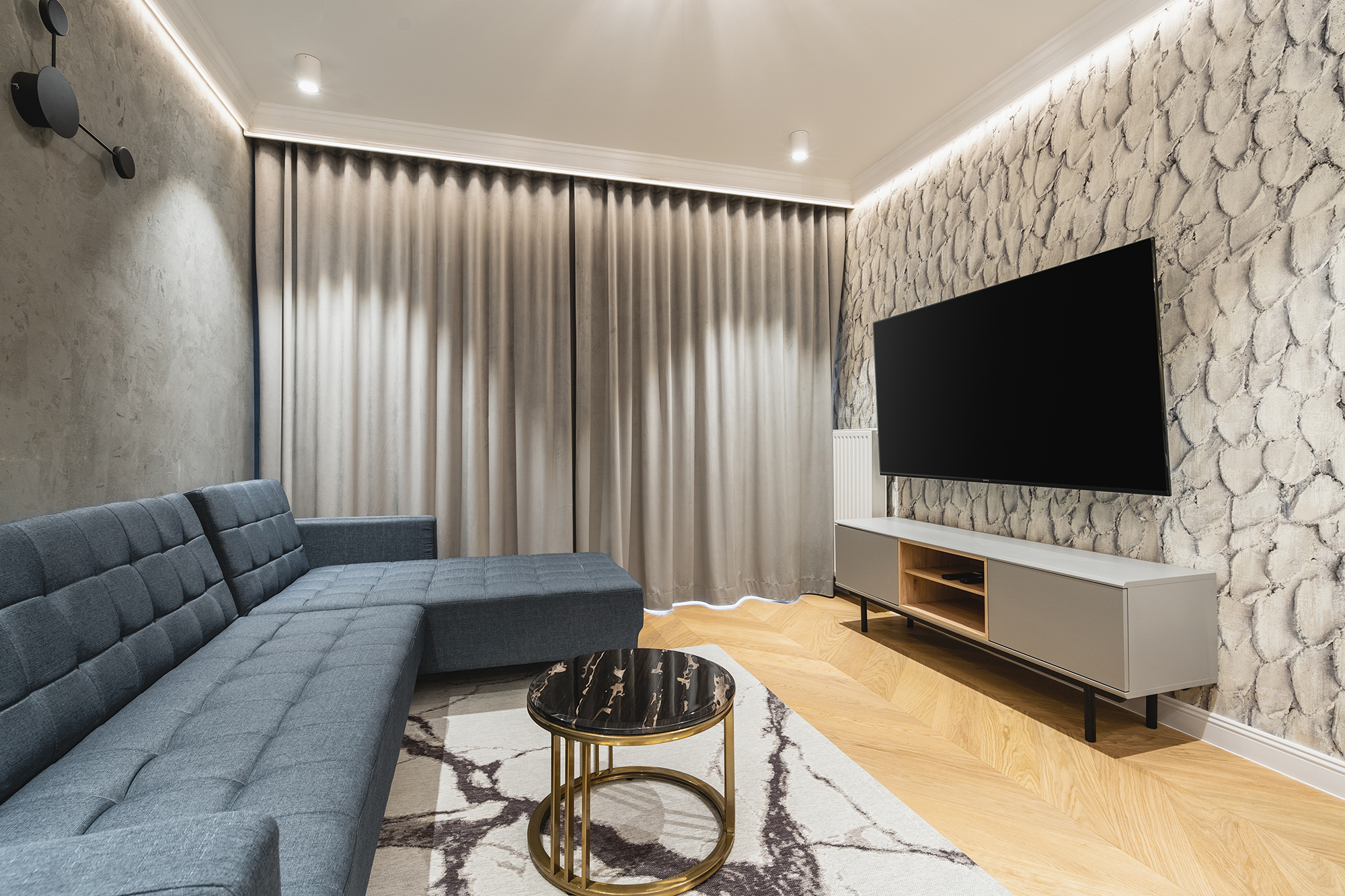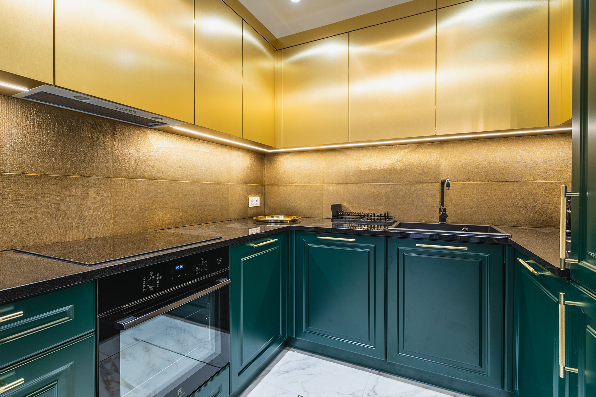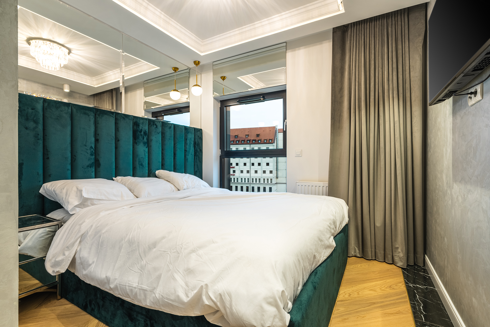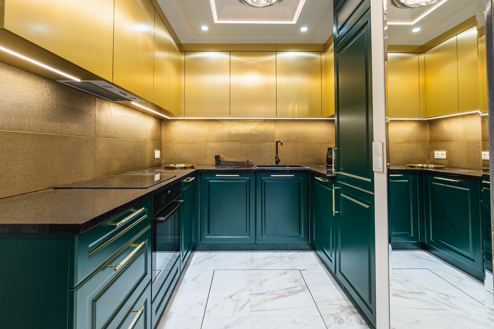 controlled on a smartphone. We used marble tiles, wallpapers and mirrors to give the apartments an elegant character.