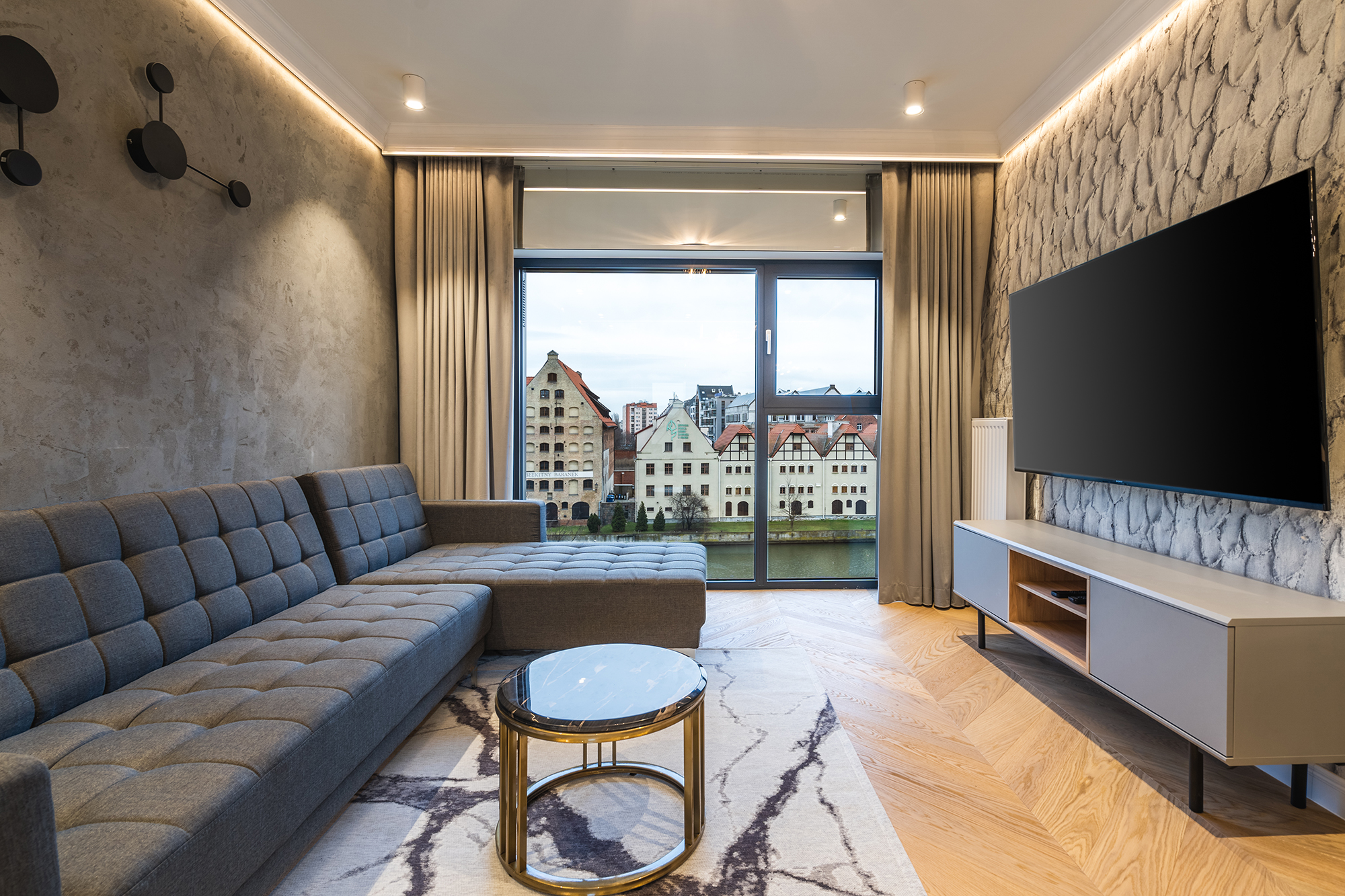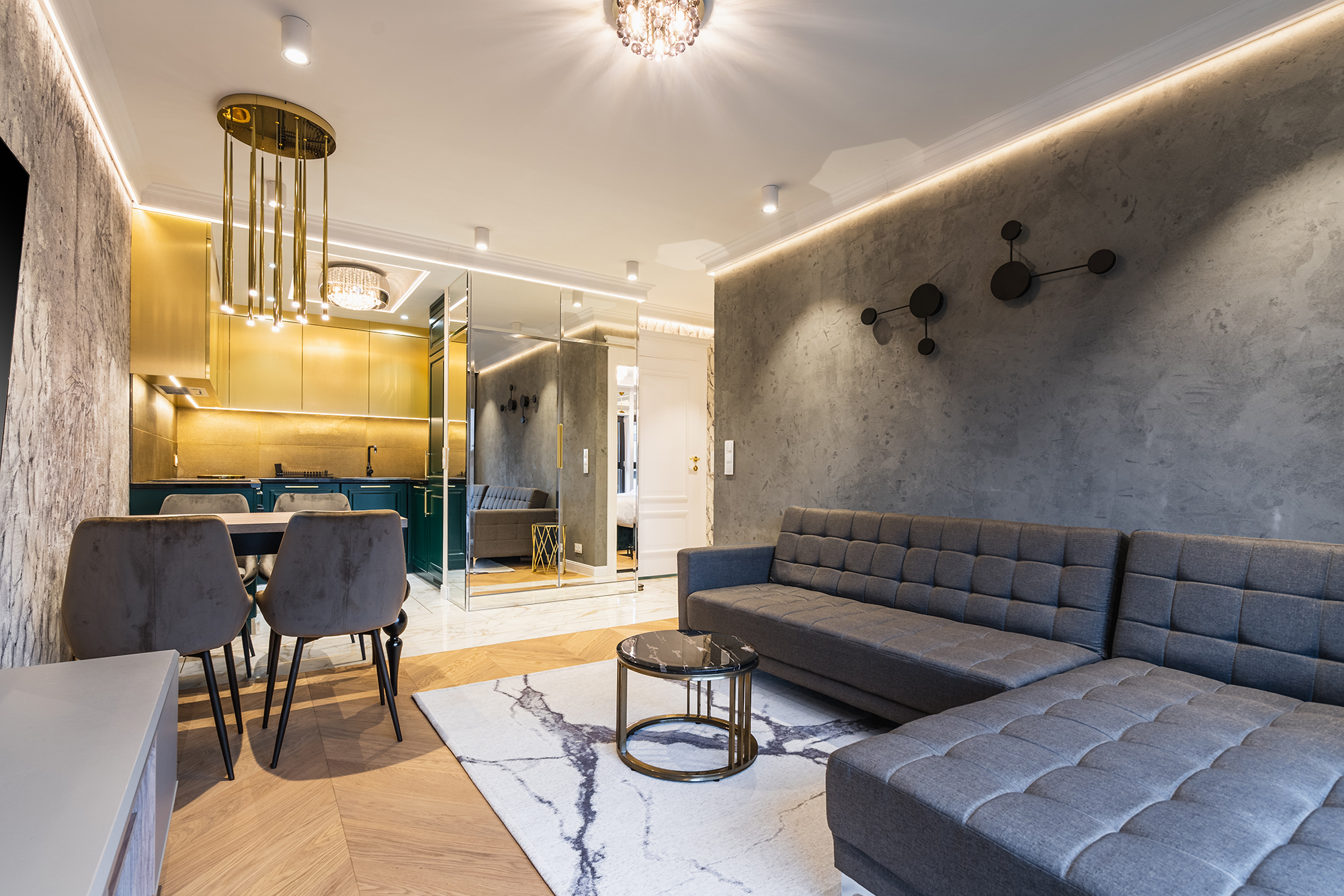 The project involved dividing an almost 100m2 flat into two smaller ones for short-term rental. The first stage was to create a vestibule with two doors to the newly built apartments and a lockable utility cabinet. Winter's investment consists of buildings located by the Motława River, with a view of the old town. The entire interior has been designed in a glamor style with the addition of colour - facilitating the recognition of apartments for short-term rent. The apartments have a sauna, which is