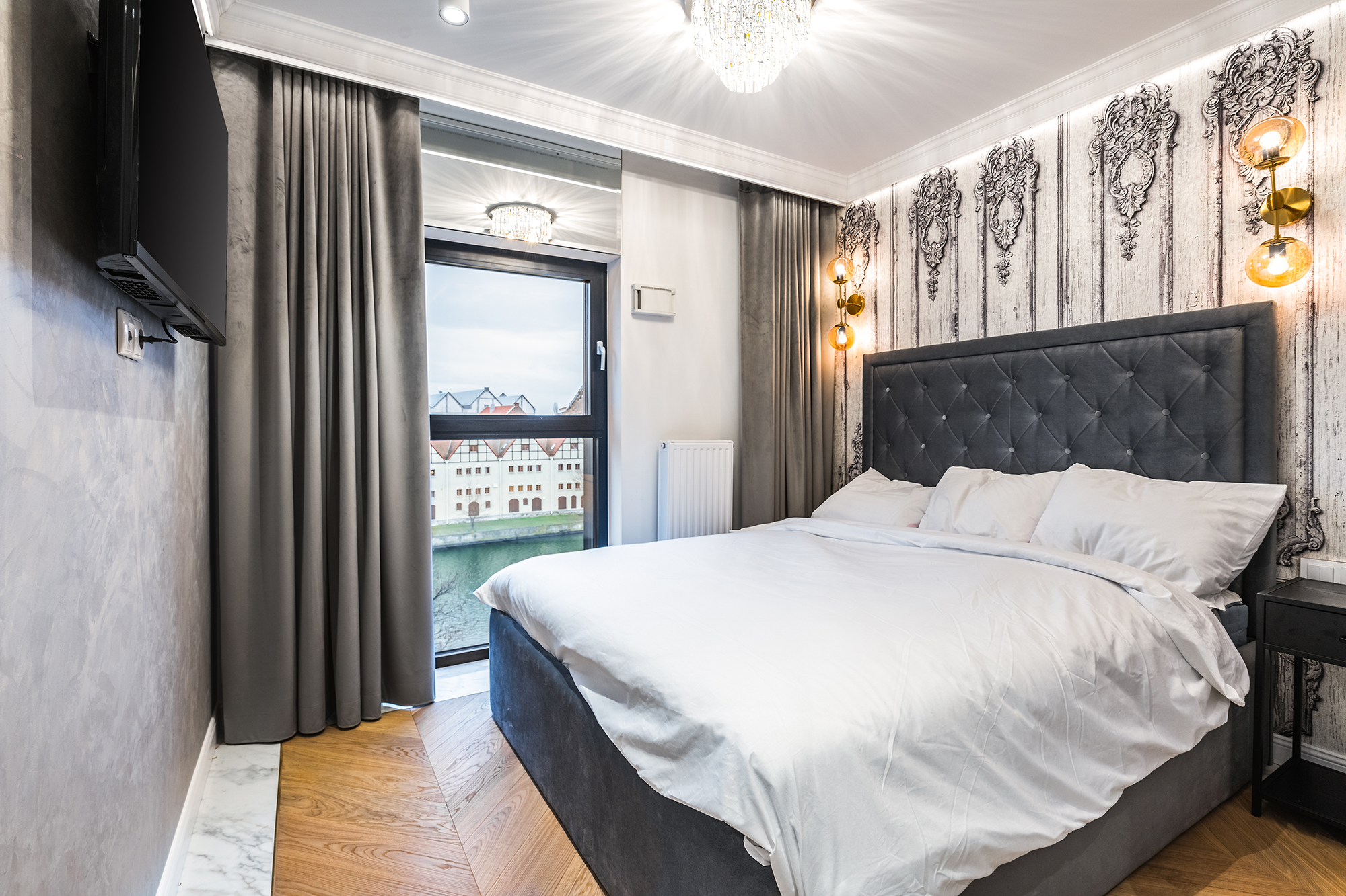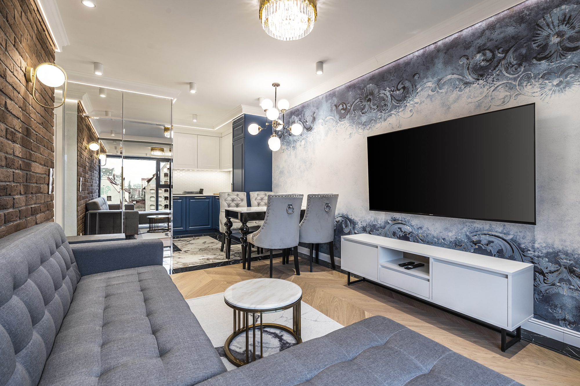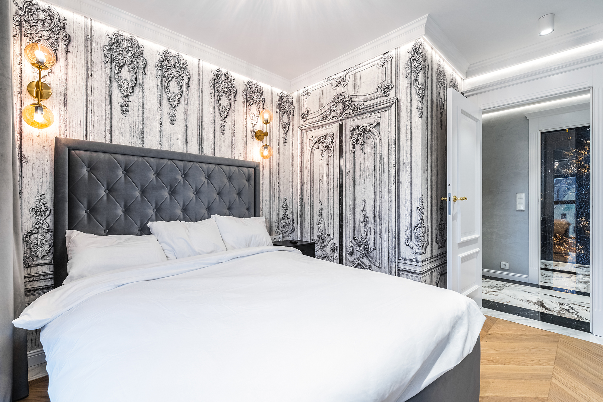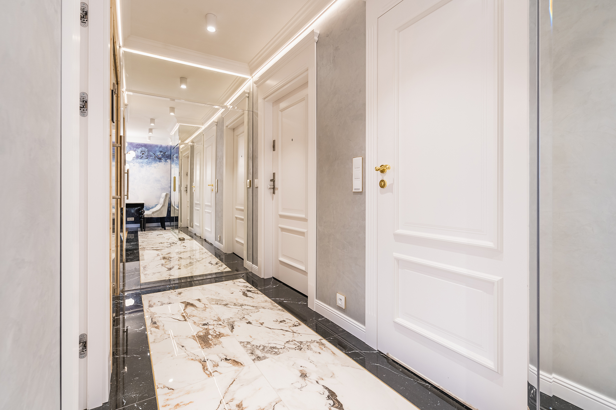 The project involved dividing an almost 100m2 flat into two smaller ones for short-term rental. The first stage was to create a vestibule with two doors to the newly built apartments and a lockable utility cabinet. Winter's investment consists of buildings located by the Motława River, with a view of the old town. The entire interior has been designed in a glamor style with the addition of colour - facilitating the recognition of apartments for short-term rent. The apartments have a sauna, which is controlled on a smartphone. We used marble tiles, wallpapers and mirrors to give the apartments an elegant character.