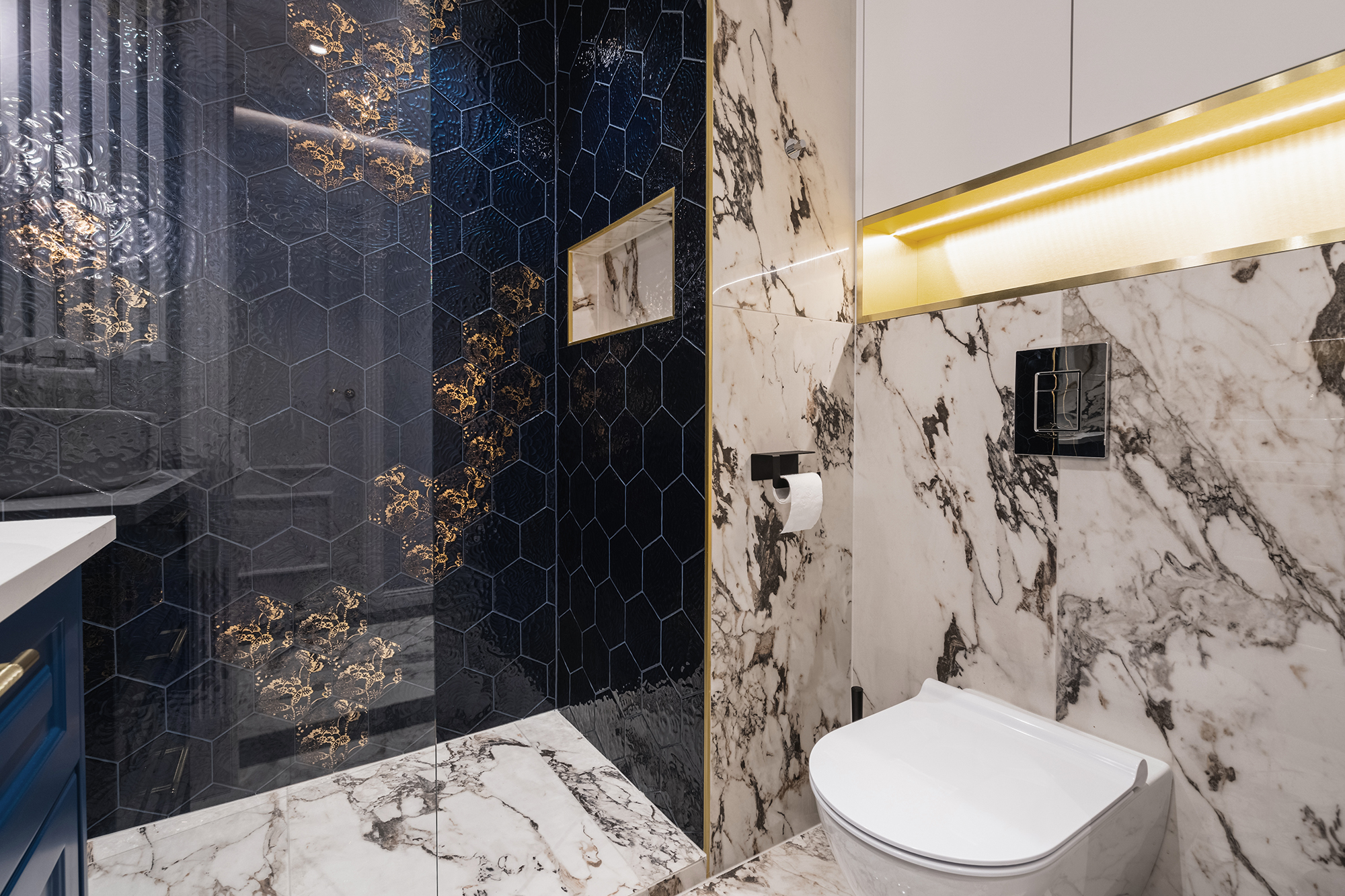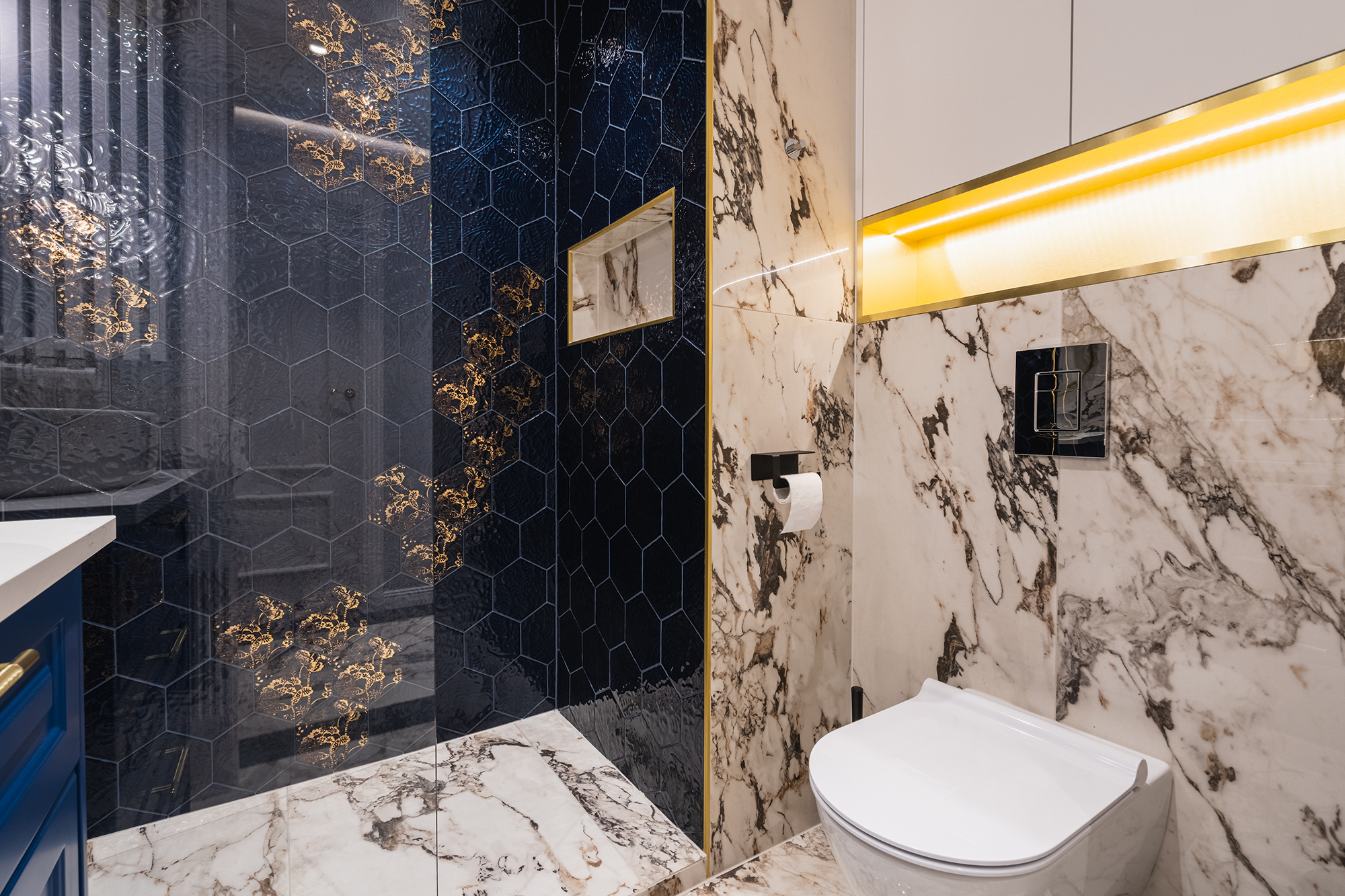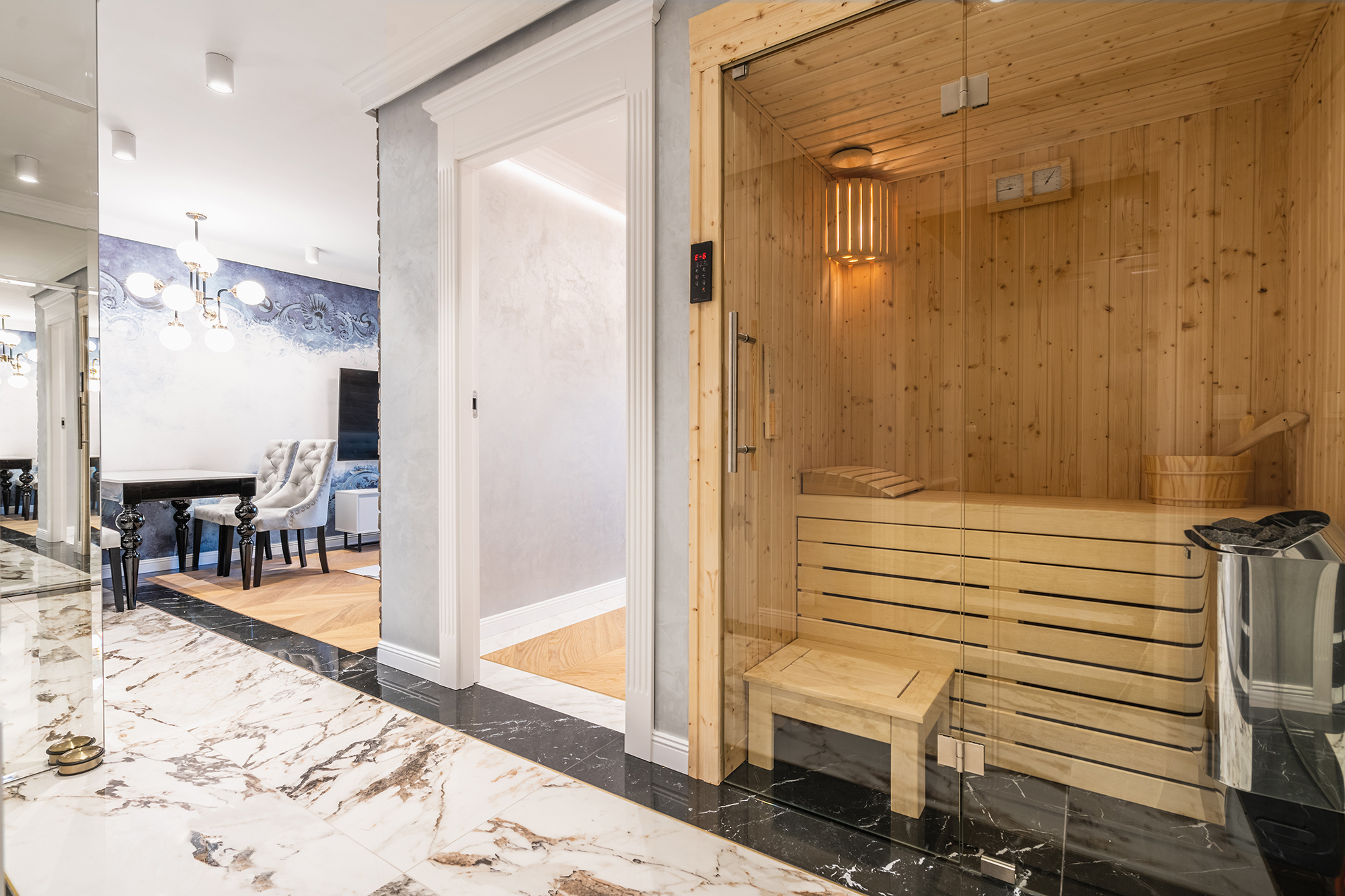 The project involved dividing an almost 100m2 flat into two smaller ones for short-term rental. The first stage was to create a vestibule with two doors to the newly built apartments and a lockable utility cabinet. Winter's investment consists of buildings located by the Motława River, with a view of the old town. The entire interior has been designed in a glamor style with the addition of colour - facilitating the recognition of apartments for short-term rent. The apartments have a sauna, which is controlled on a smartphone. We used marble tiles, wallpapers and mirrors to give the apartments an elegant character.