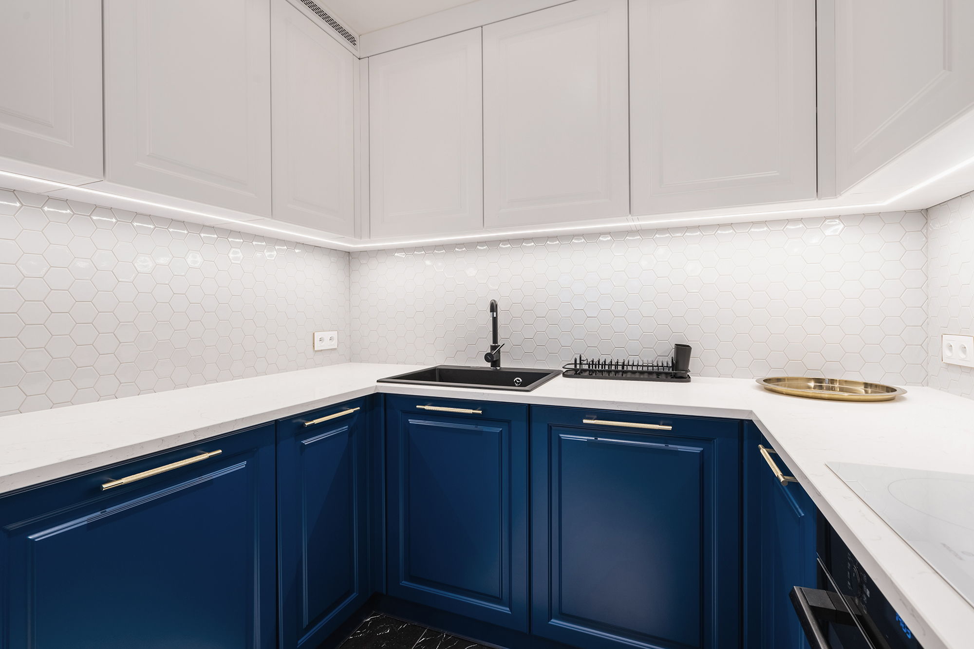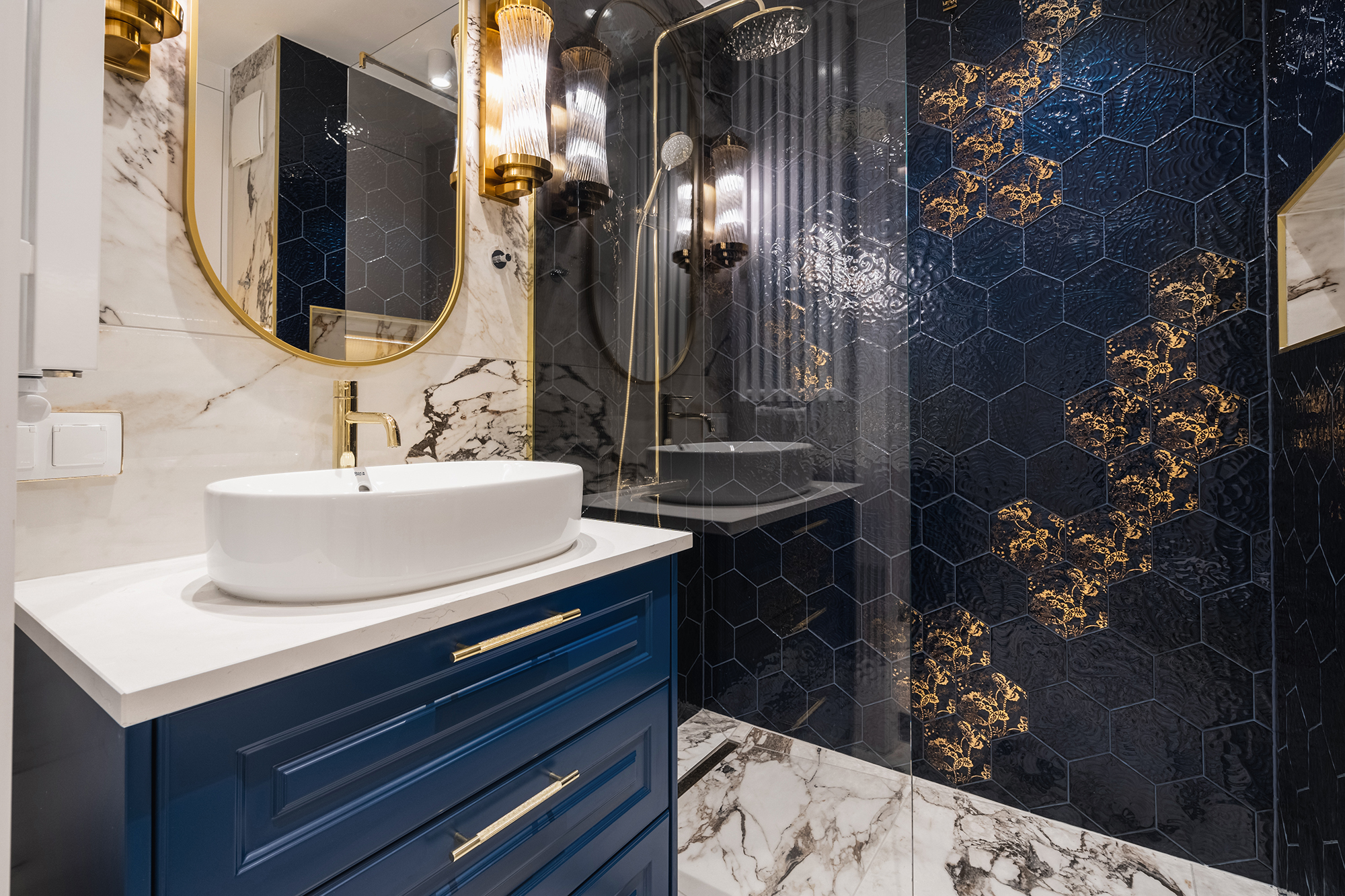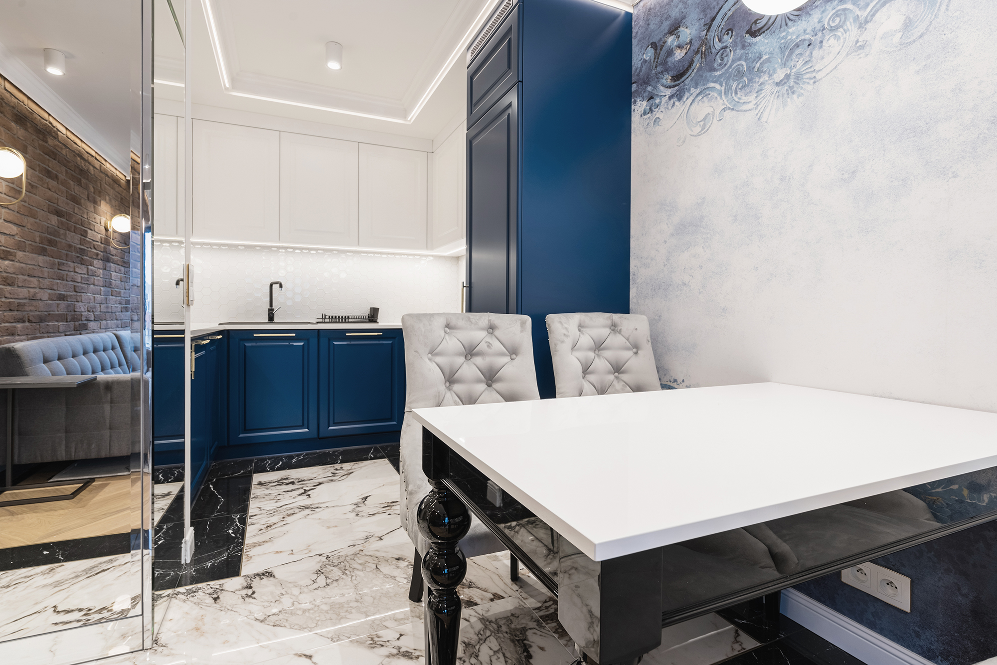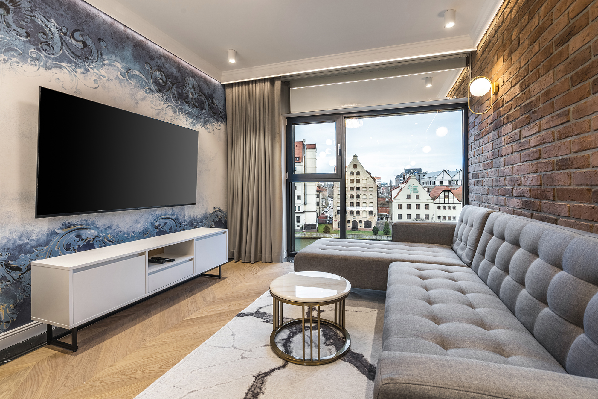 The project involved dividing an almost 100m2 flat into two smaller ones for short-term rental. The first stage was to create a vestibule with two doors to the newly built apartments and a lockable utility cabinet. Winter's investment consists of buildings located by the Motława River, with a view of the old town. The entire interior has been designed in a glamor style with the addition of colour - facilitating the recognition of apartments for short-term rent. The apartments have a sauna, which is controlled on a smartphone. We used marble tiles, wallpapers and mirrors to give the apartments an elegant character.