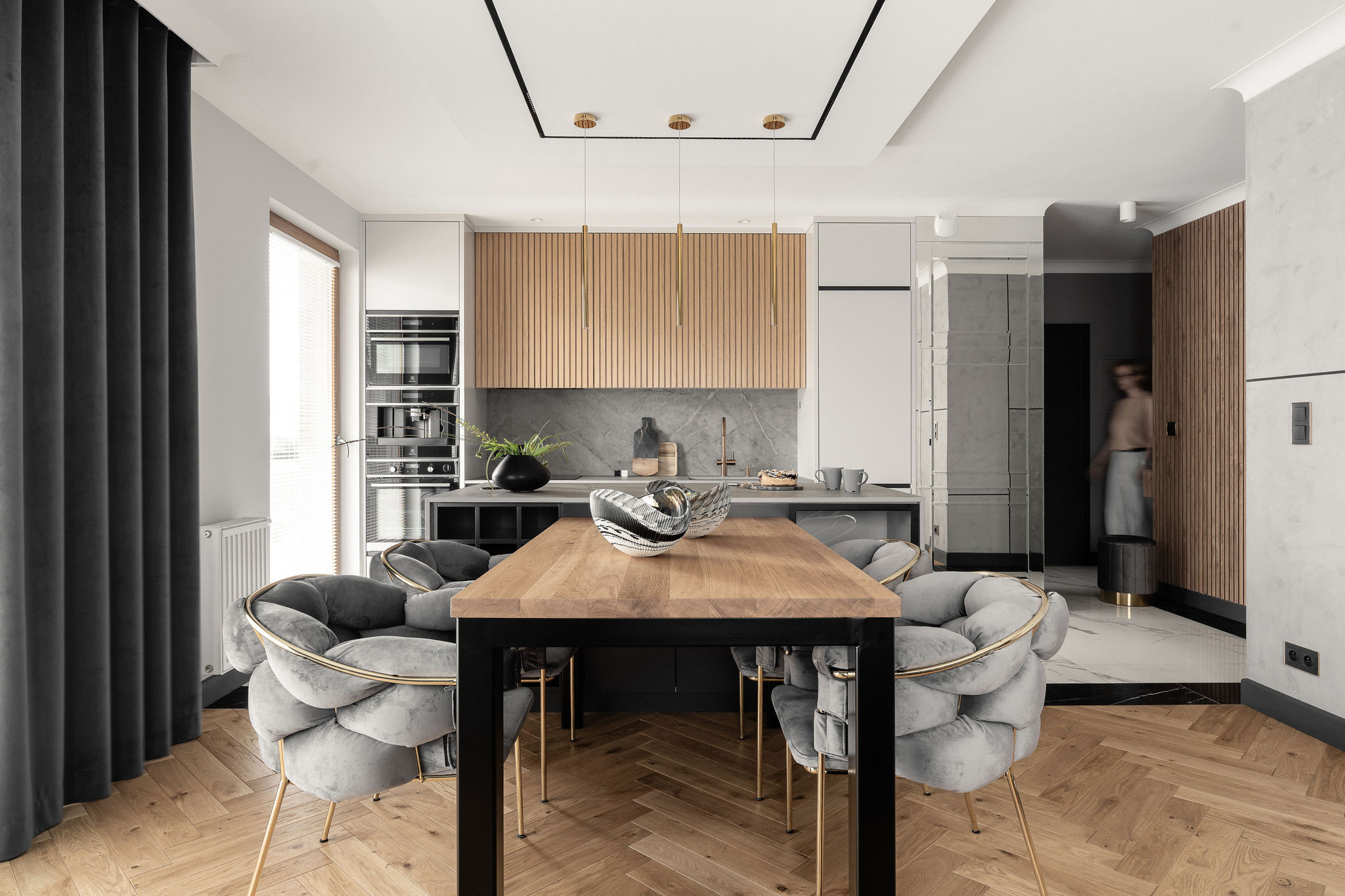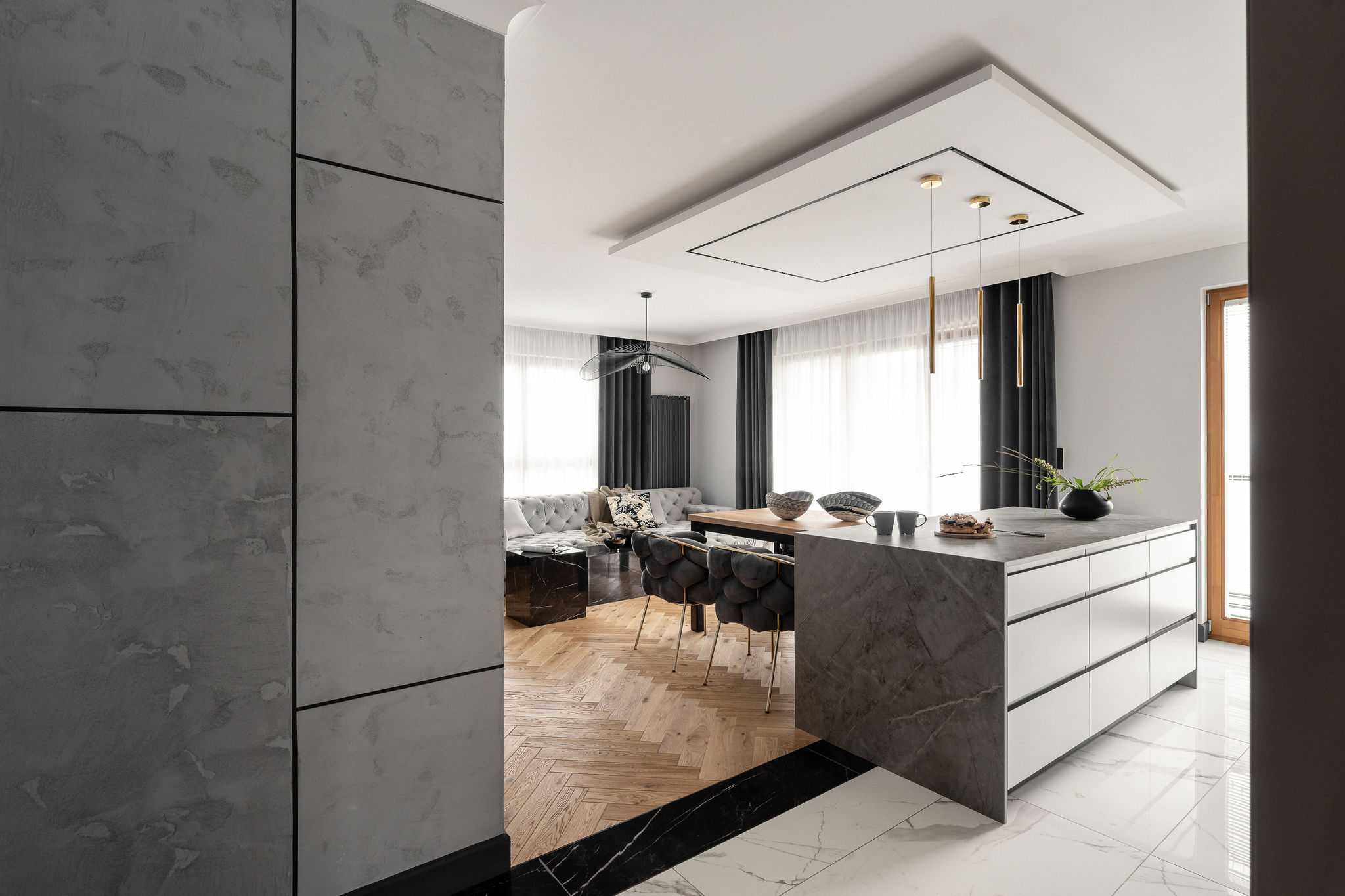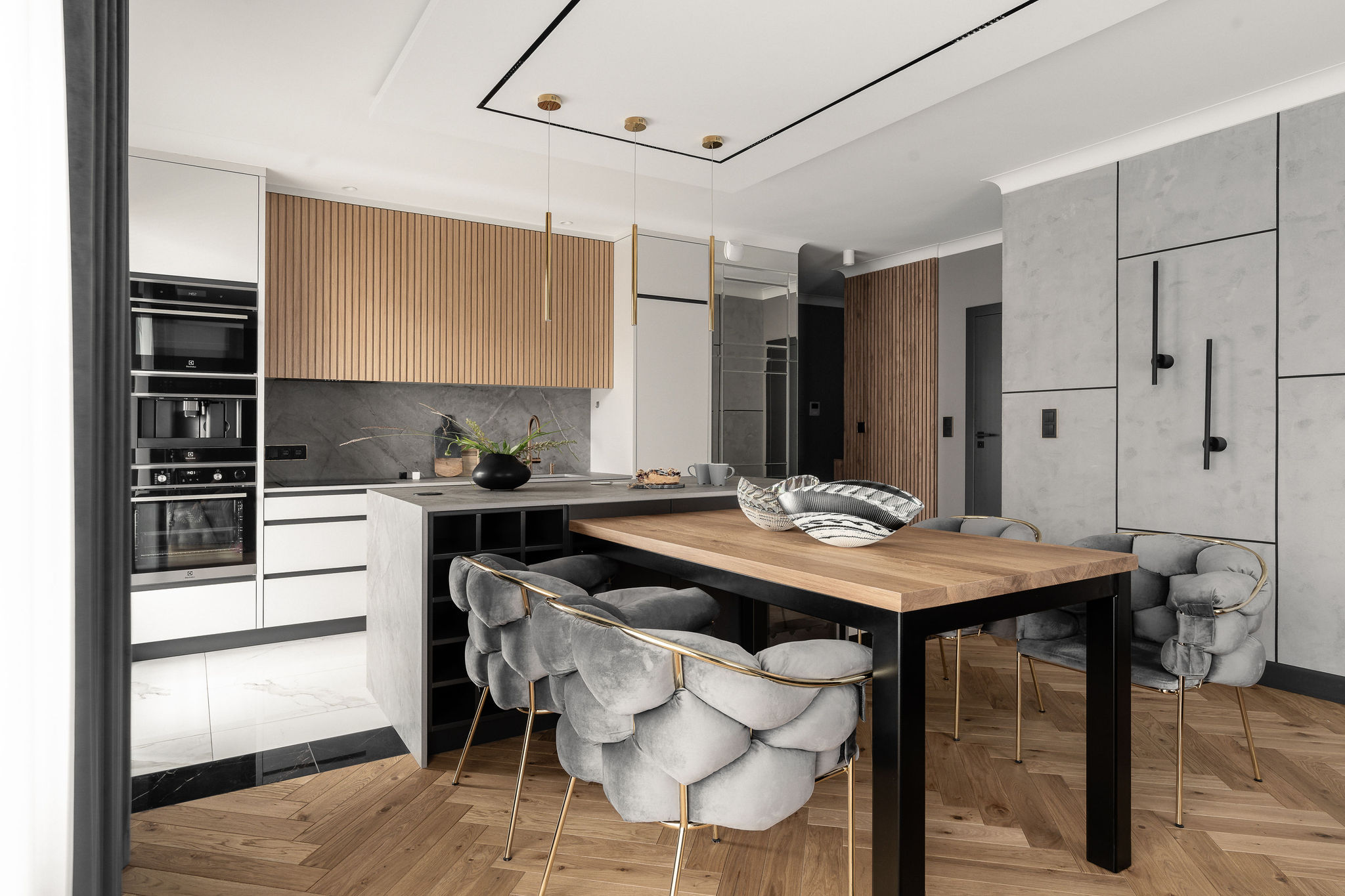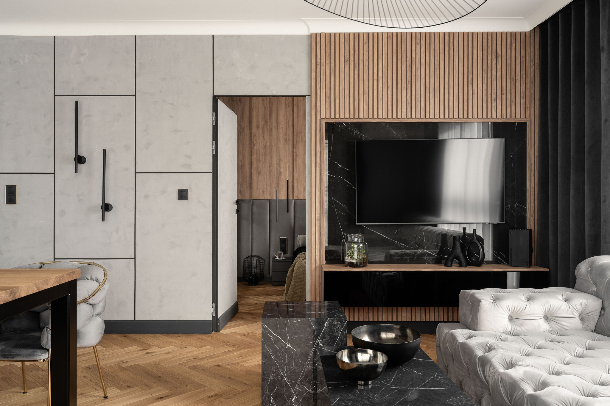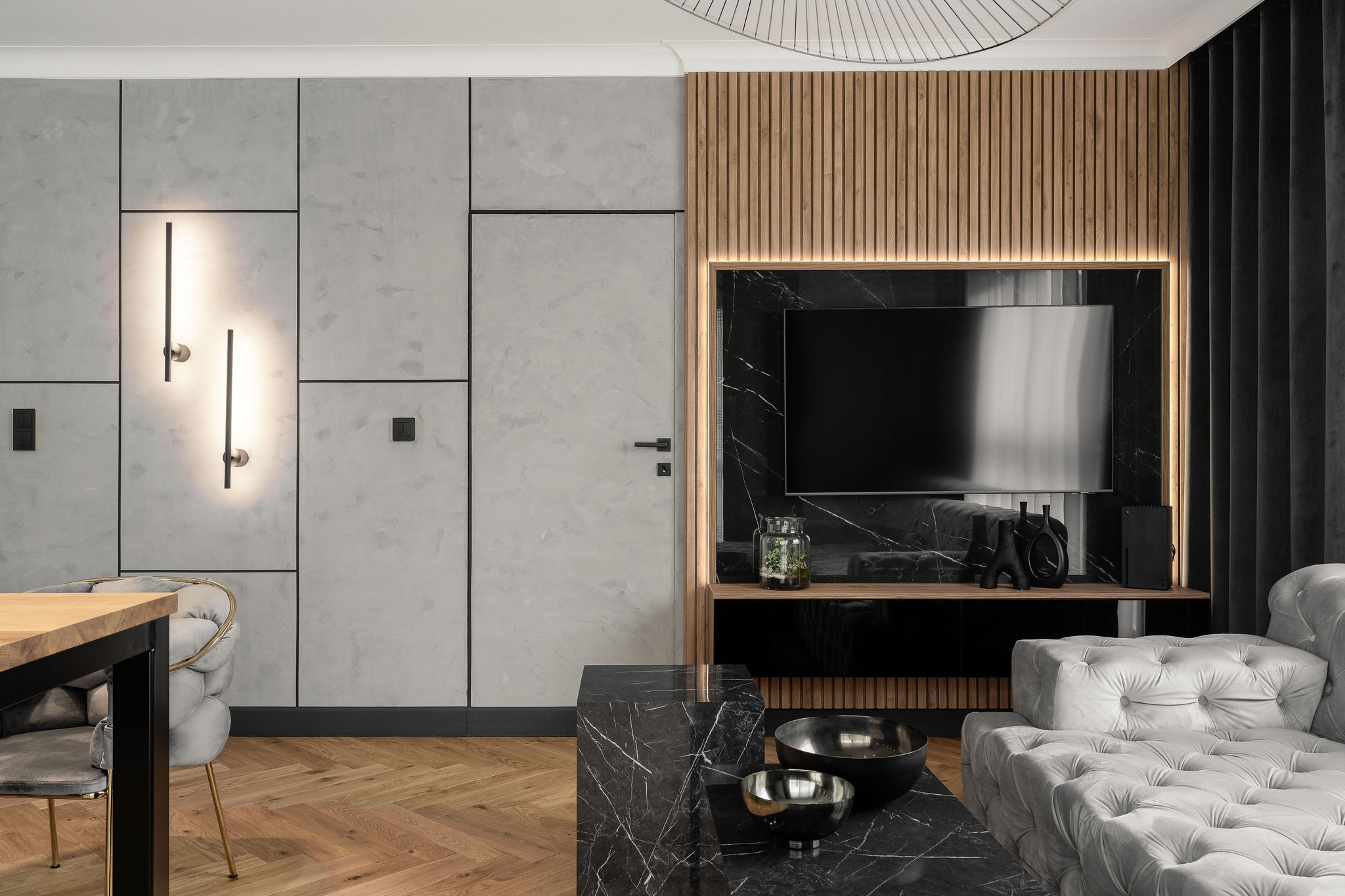 A modern apartment for a young couple without kitsch and cliché ? At Zajezdnia Wrzeszcz housing estate we created interiors based on a modern and loft style. According to owner’s request we adorned the apartment with glamorous elements, such as golden lamps, comfortable upholstery and marble tiles. The combination of these materials is definitely trivial but the effect exceeded our expectations. The main accent of the apartment is a concrete plaster wall hand-made by our team that imitates concrete slabs. The door to the bedroom was also hidden in it. Wood also plays an important role in this interior in the form of classic oak fir on the floor and lamellas and MDF boards in custom-made furniture. Everything refined to the last detail.