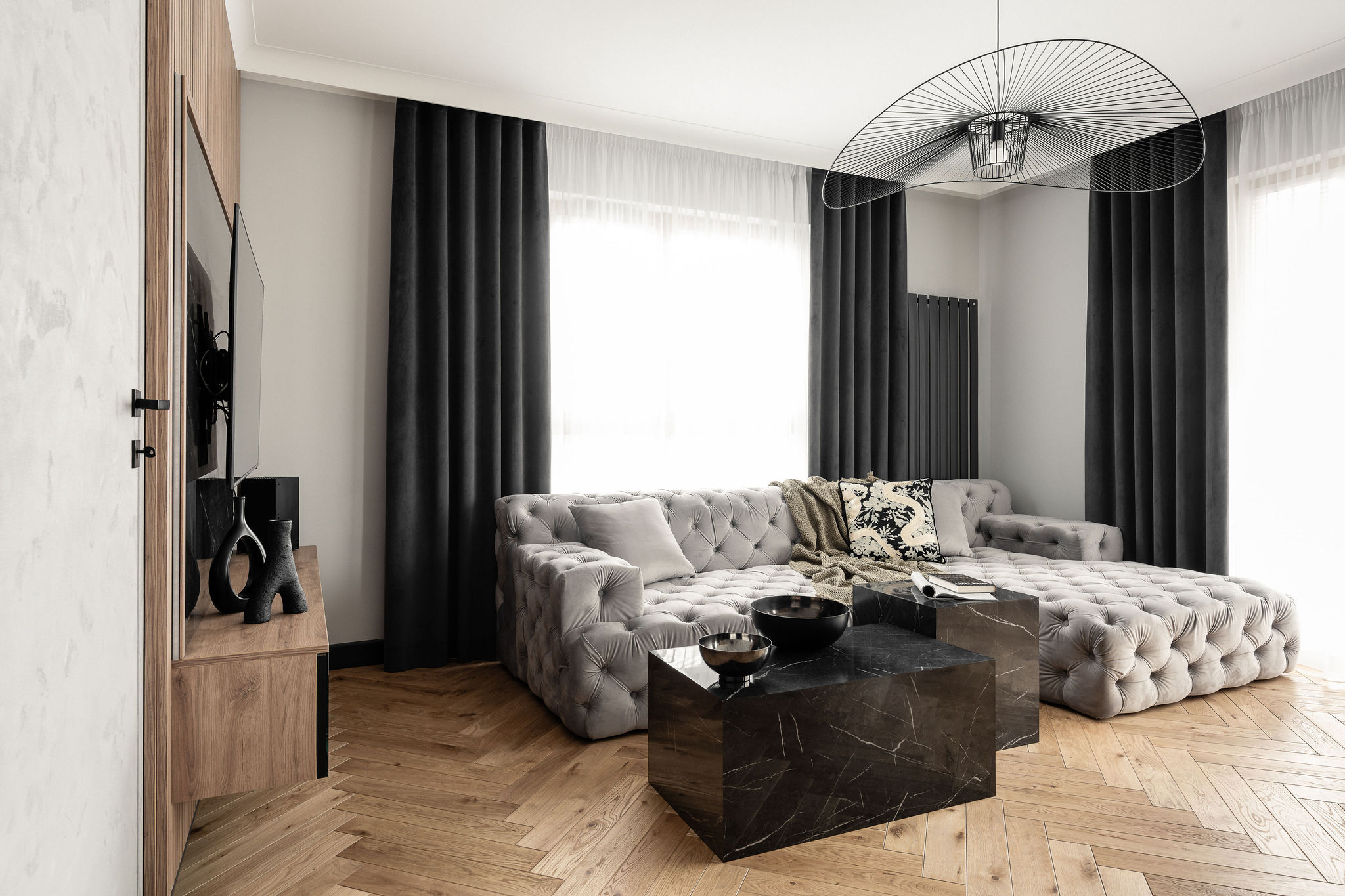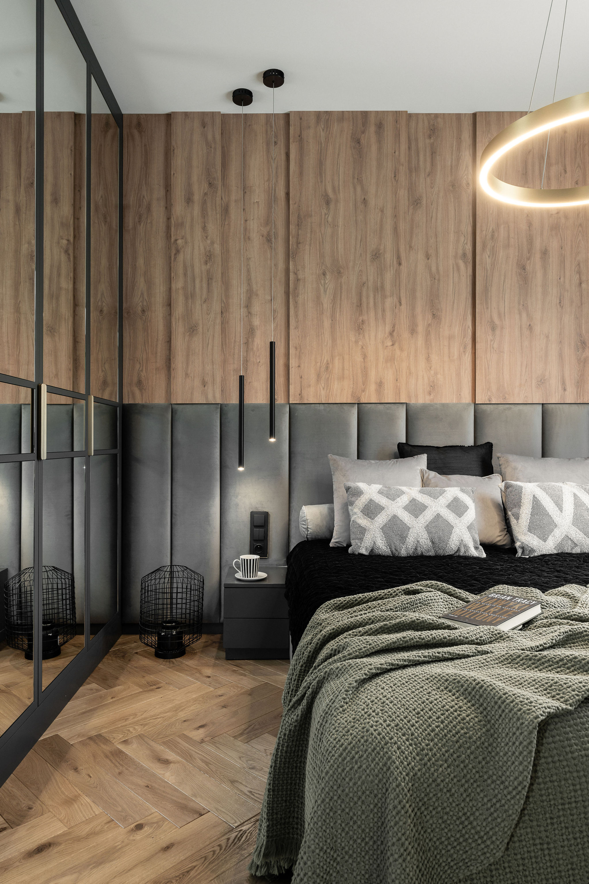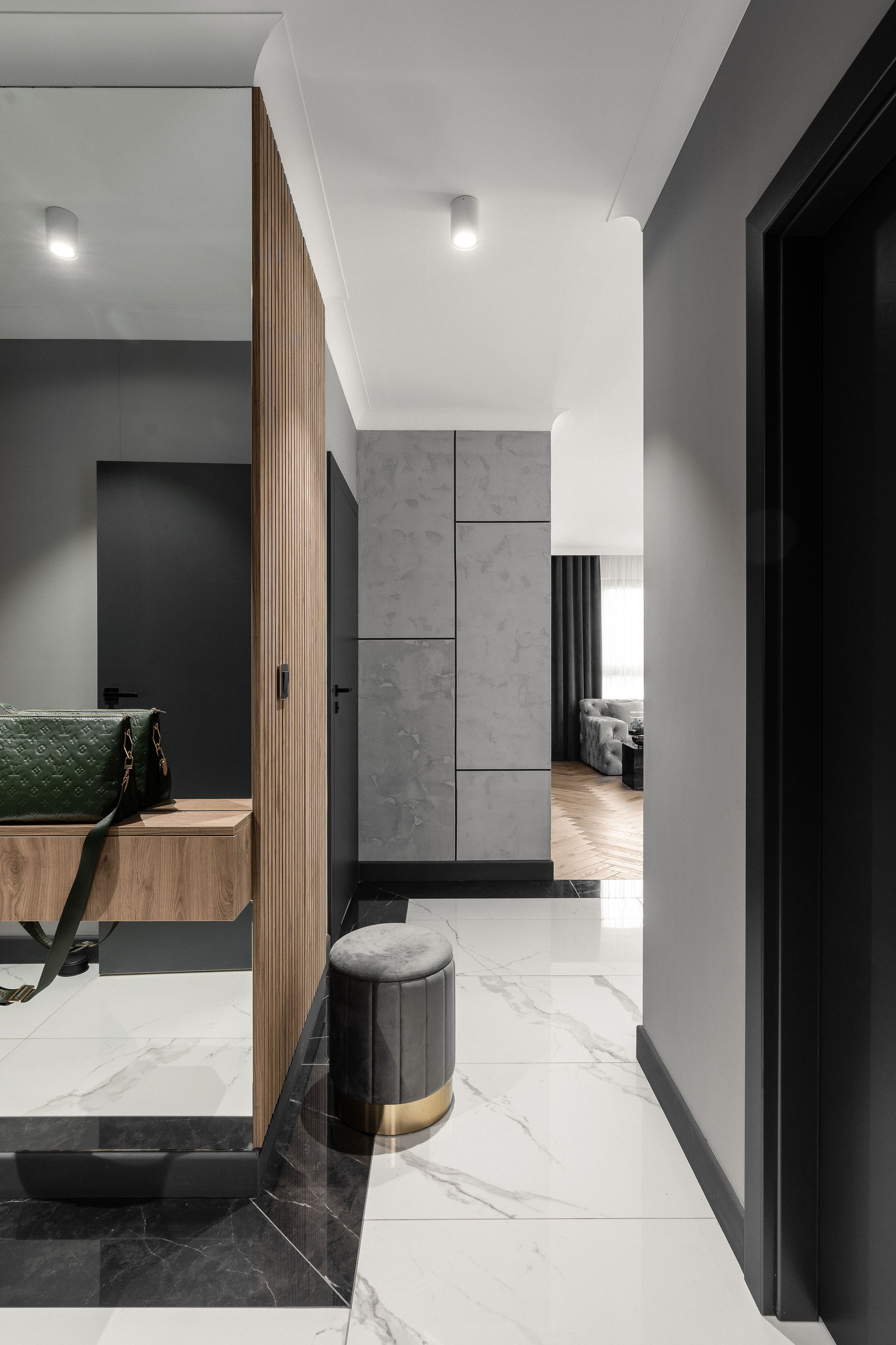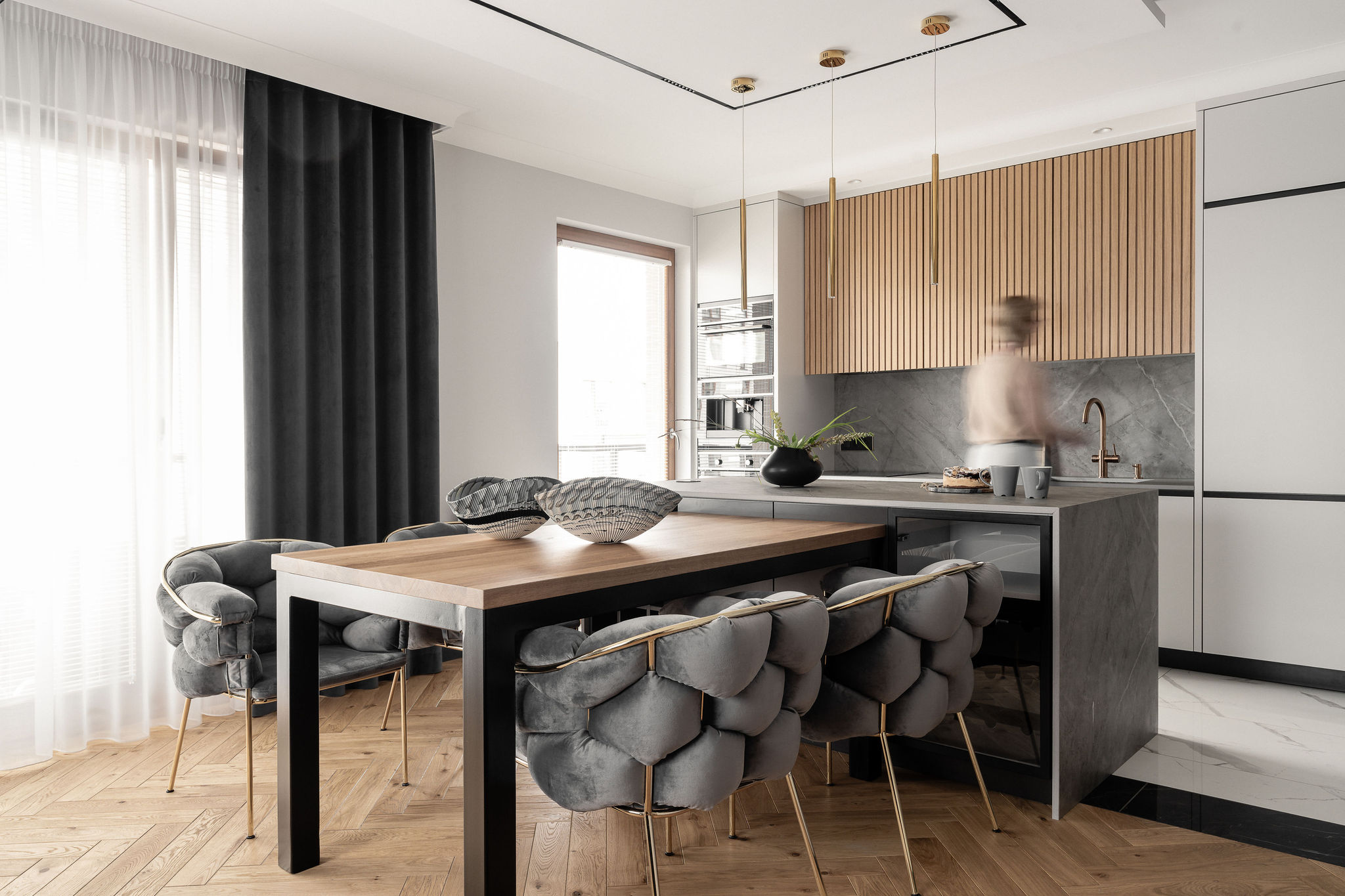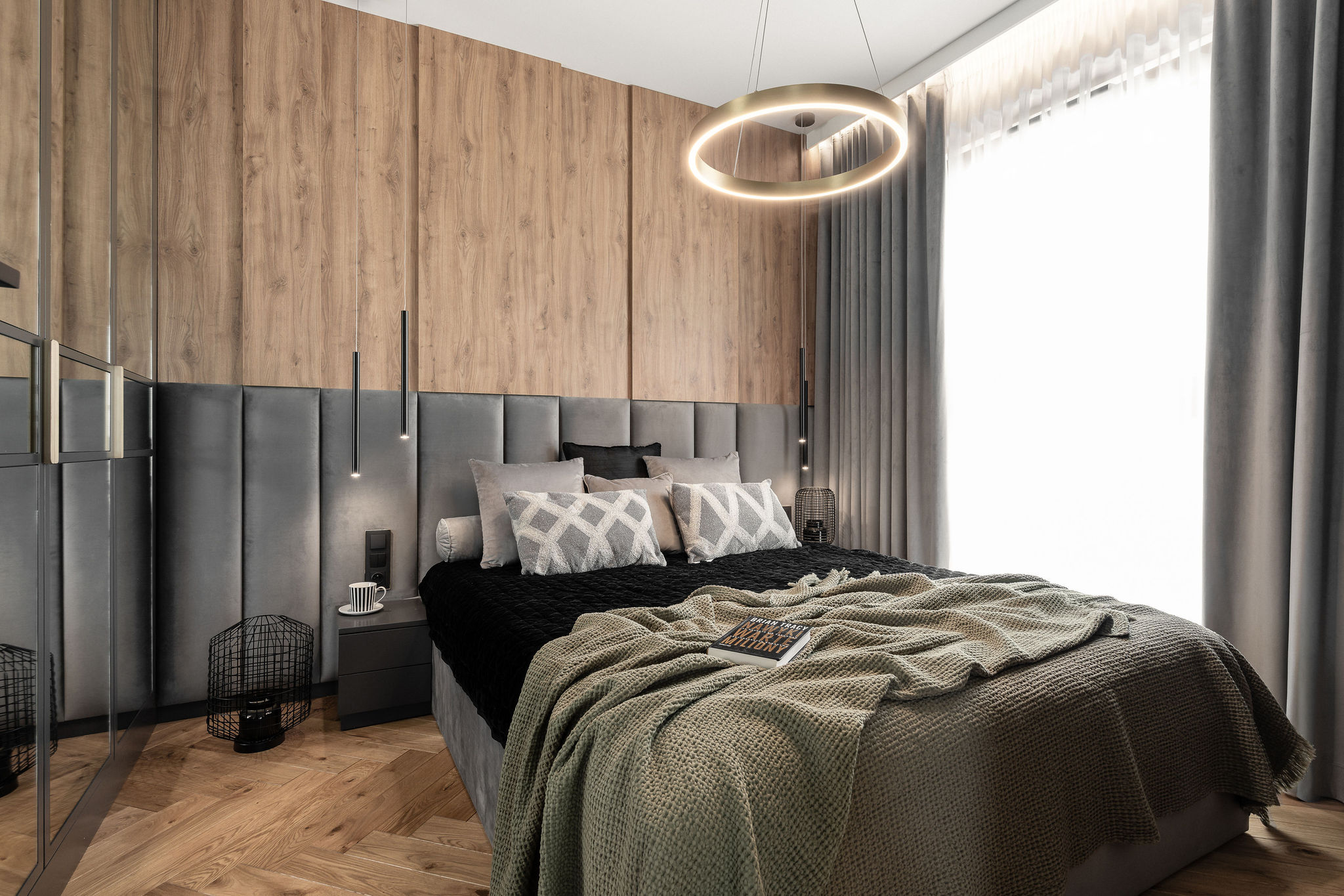 A modern apartment for a young couple without kitsch and cliché ? At Zajezdnia Wrzeszcz housing estate we created interiors based on a modern and loft style. According to owner’s request we adorned the apartment with glamorous elements, such as golden lamps, comfortable upholstery and marble tiles. The combination of these materials is definitely trivial but the effect exceeded our expectations. The main accent of the apartment is a concrete plaster wall hand-made by our team that imitates concrete slabs. The door to the bedroom was also hidden in it. Wood also plays an important role in this interior in the form of classic oak fir on the floor and lamellas and MDF boards in custom-made furniture. Everything refined to the last detail.