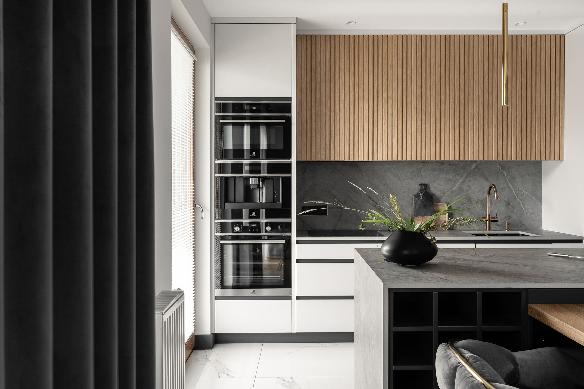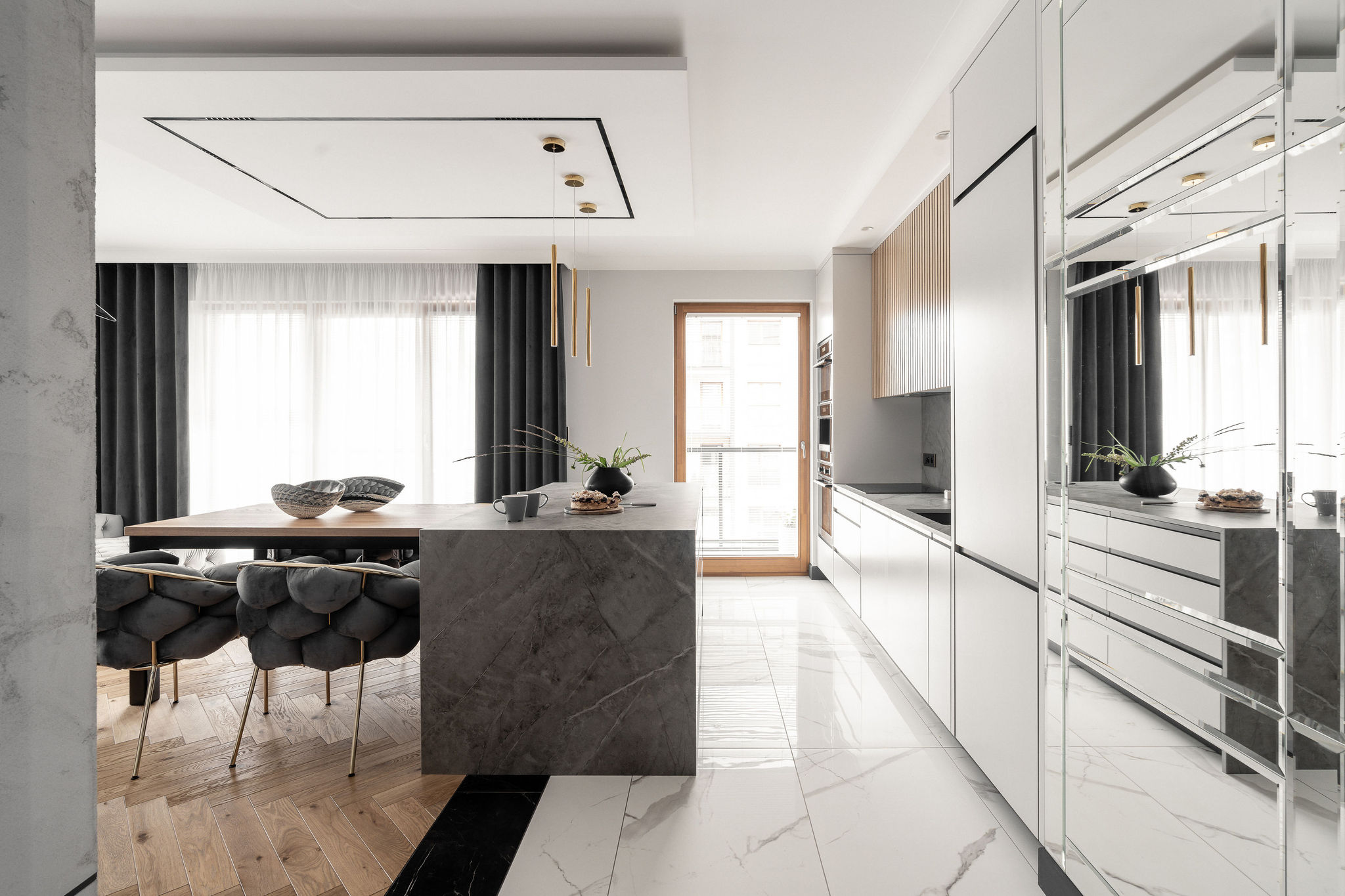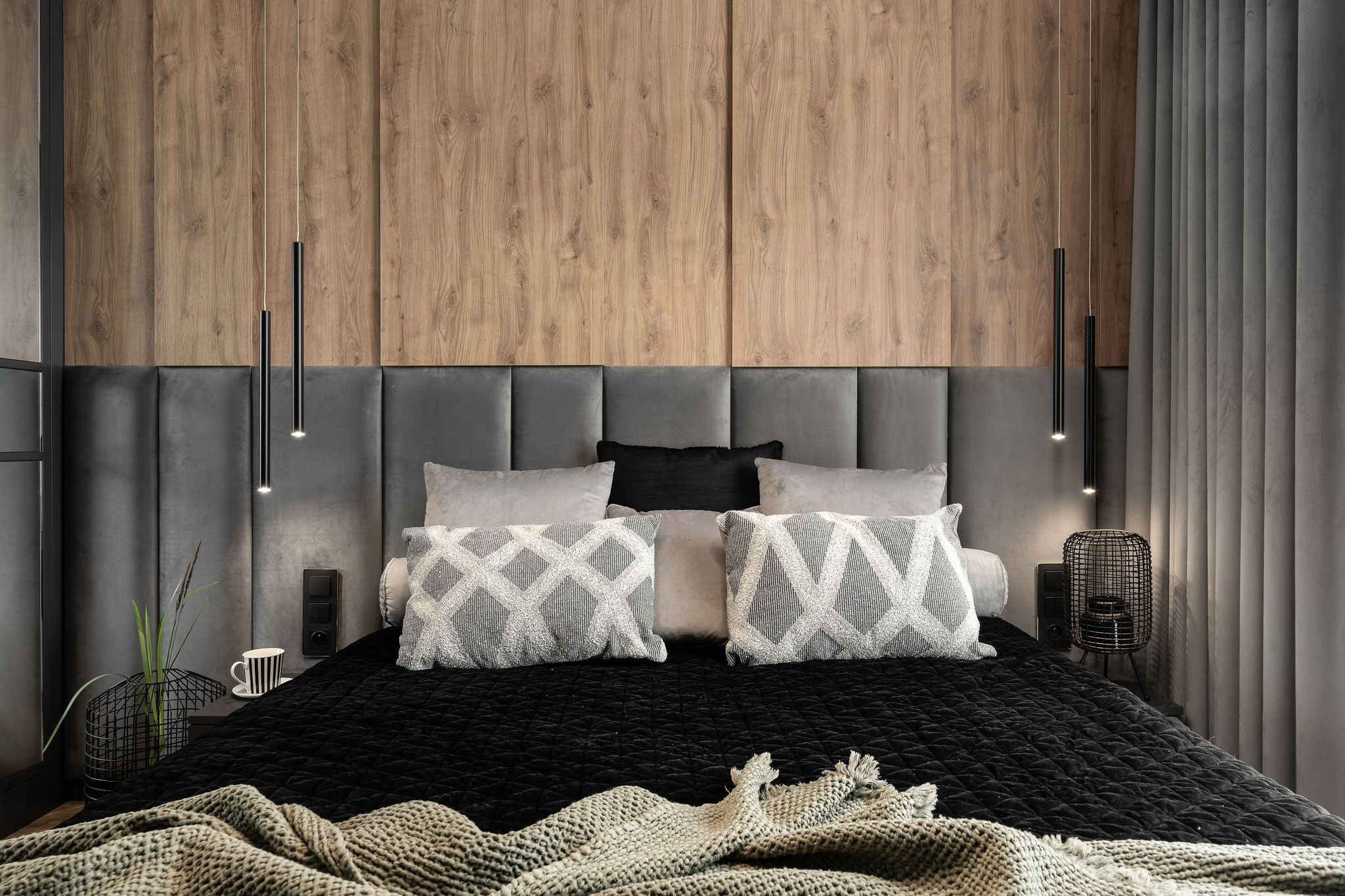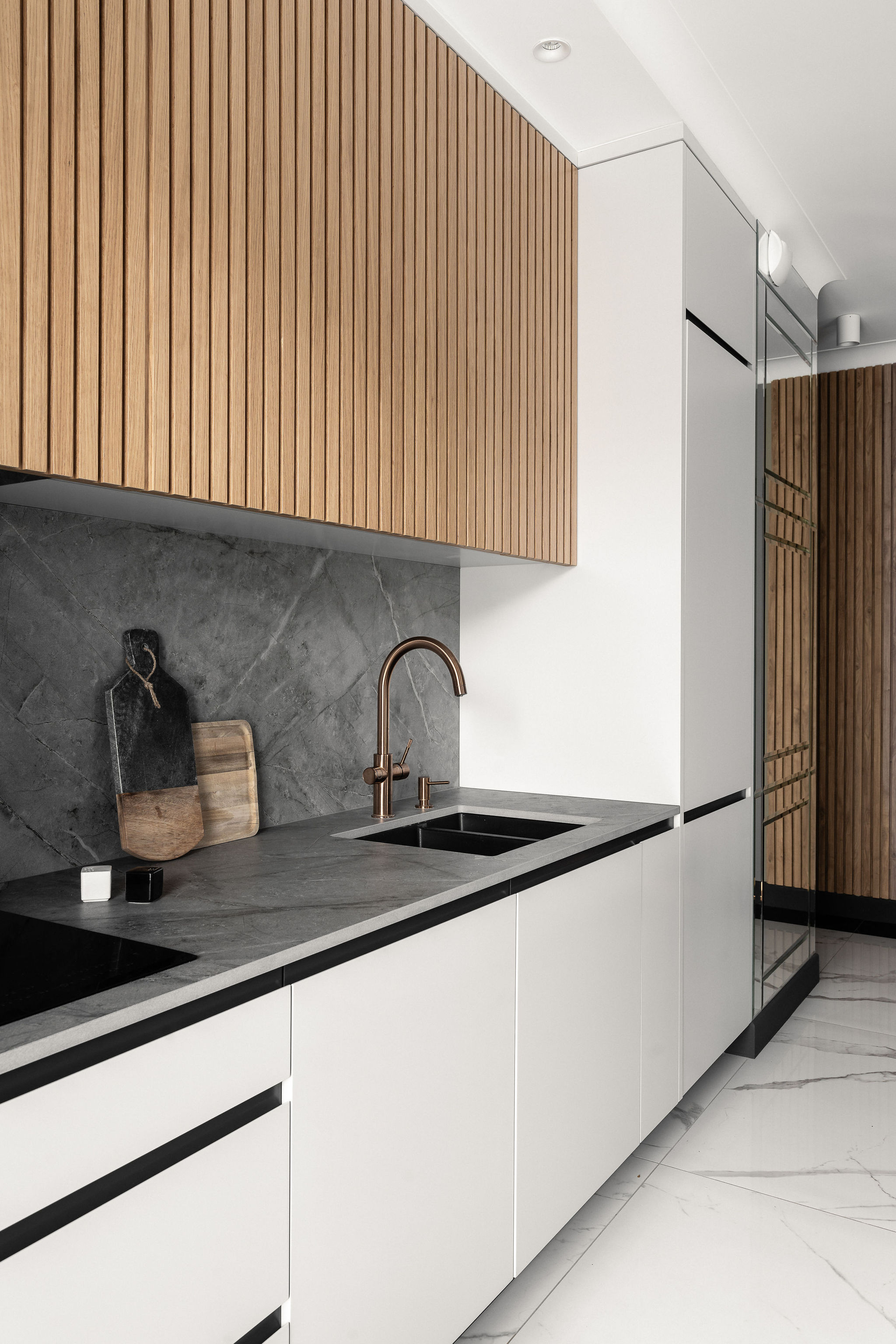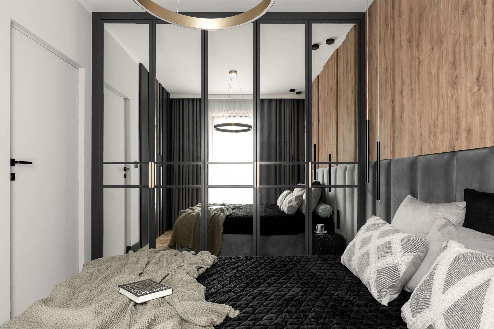 A modern apartment for a young couple without kitsch and cliché ? At Zajezdnia Wrzeszcz housing estate we created interiors based on a modern and loft style. According to owner’s request we adorned the apartment with glamorous elements, such as golden lamps, comfortable upholstery and marble tiles. The combination of these materials is definitely trivial but the effect exceeded our expectations. The main accent of the apartment is a concrete plaster wall hand-made by our team that imitates concrete slabs. The door to the bedroom was also hidden in it. Wood also plays an important role in this interior in the form of classic oak fir on the floor and lamellas and MDF boards in custom-made furniture. Everything refined to the last detail.