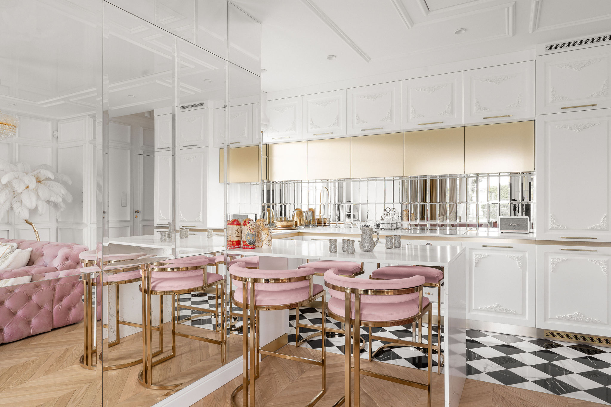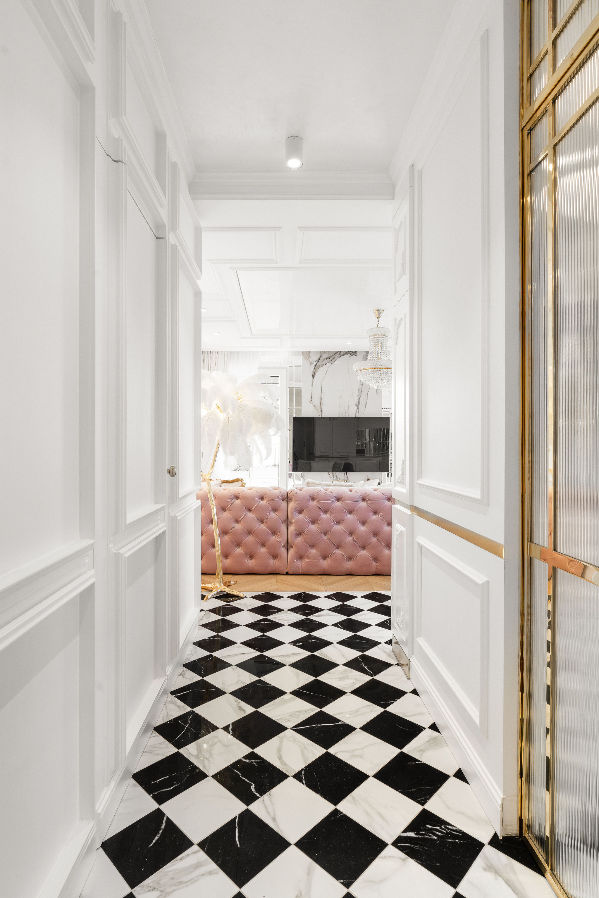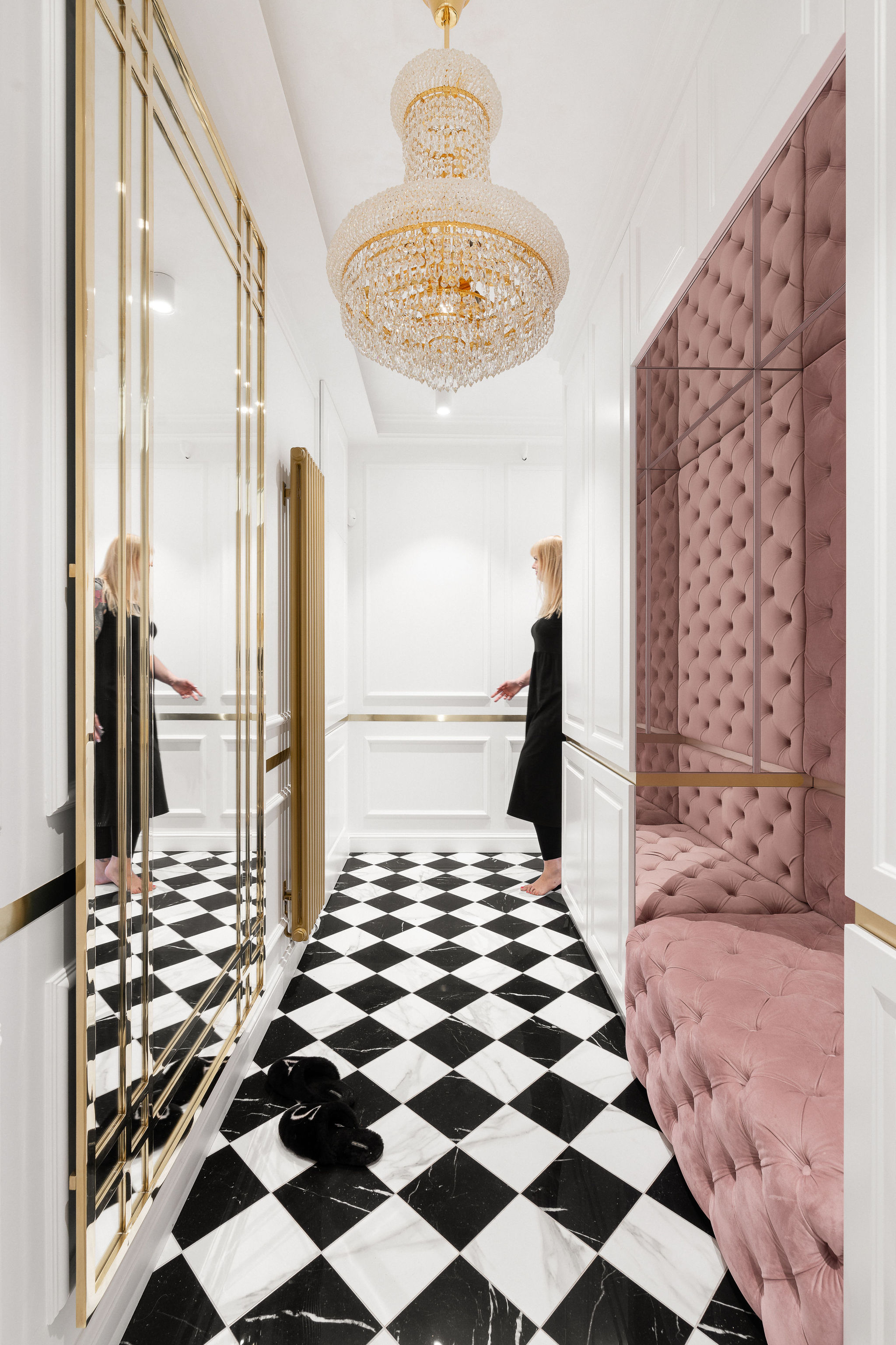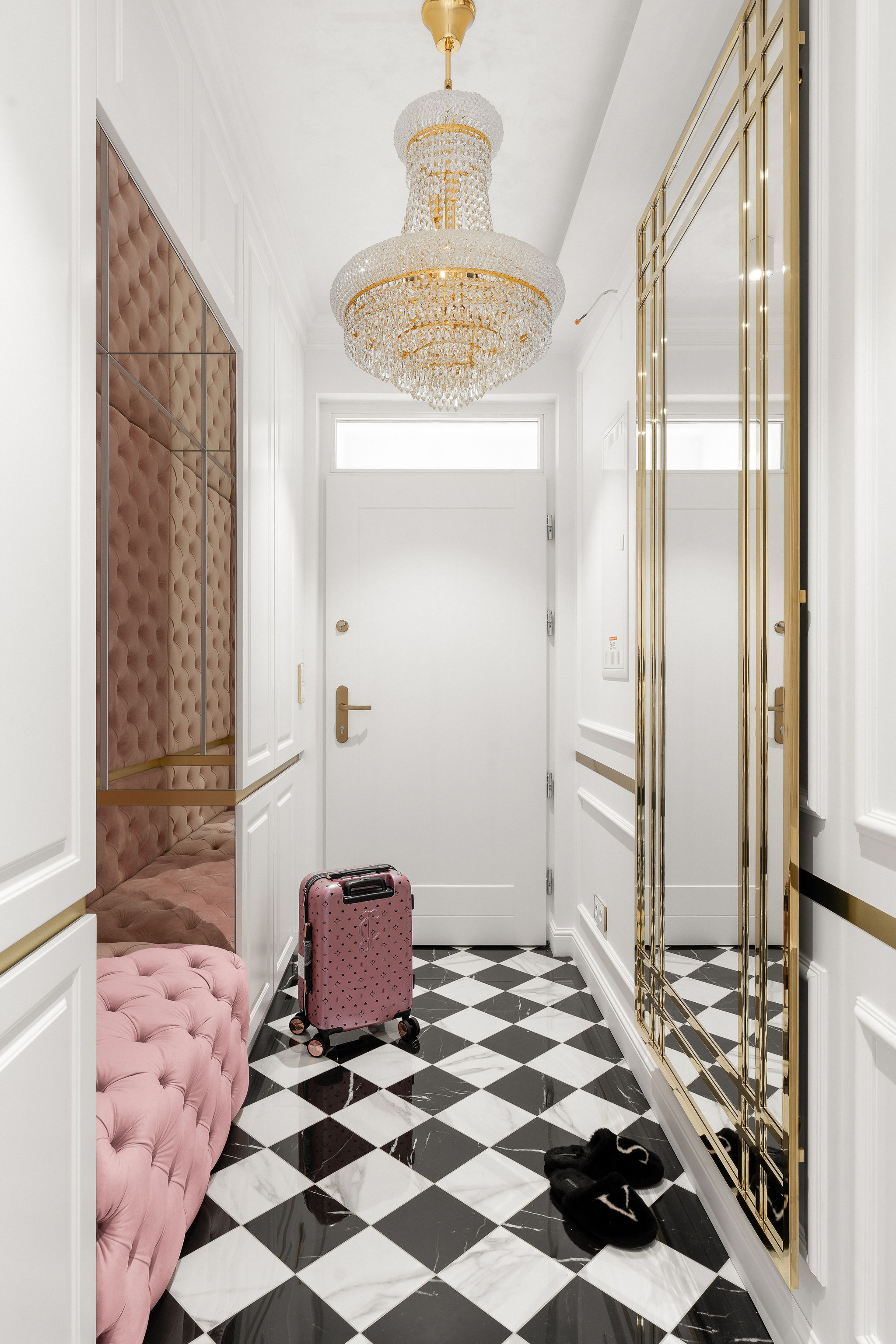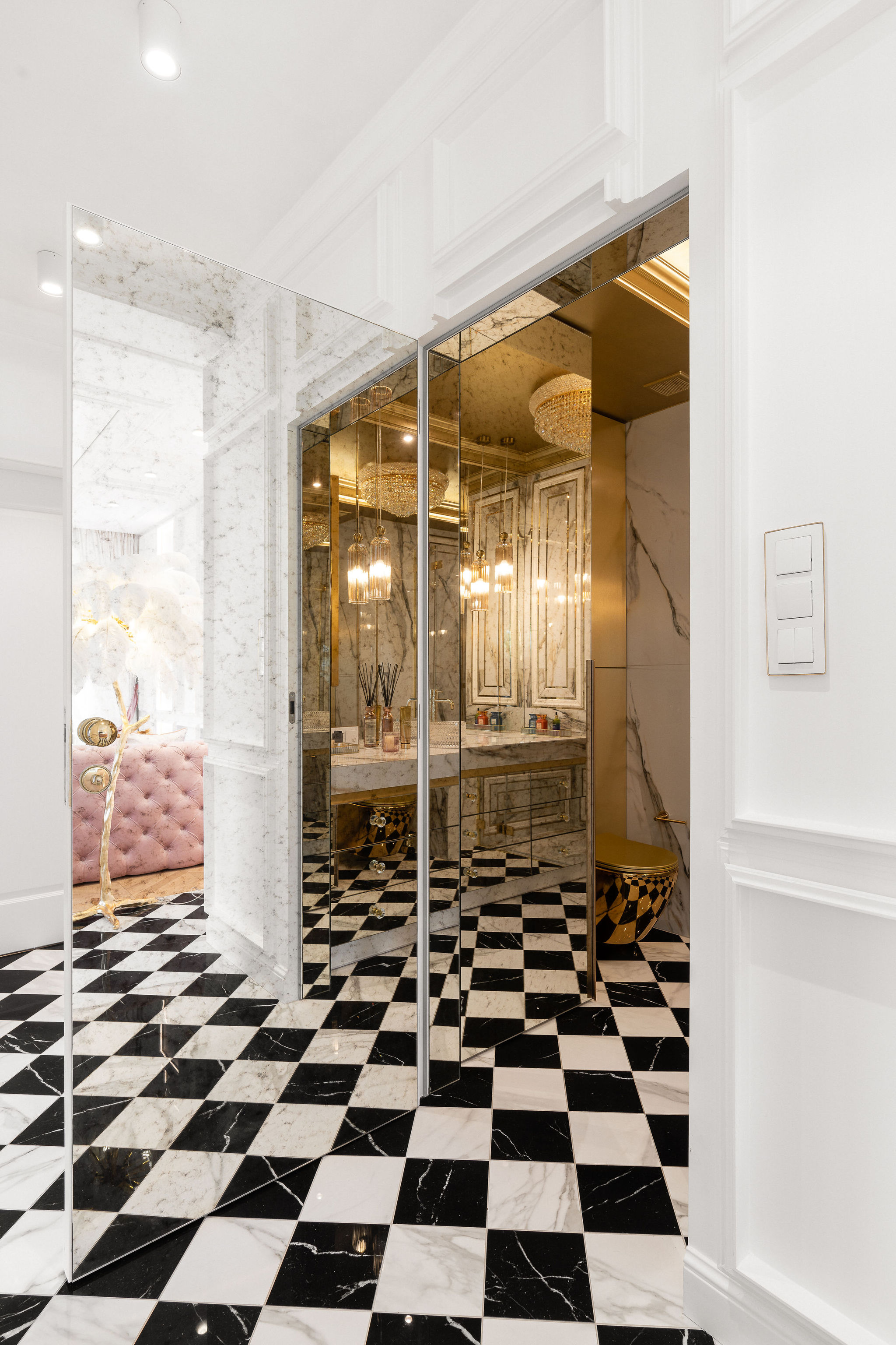 From the beginning the main elements of the project were black and white diamond tiles, powder pink colour, a ton of moulding and crystal chandeliers. To make them more stylish we decided to change the format to 20 x 20 and use marble print tiles. Mirrors and lighting are very important in Zusje's apartment due to her type of work - being an influencer. Every wall is supposed to be photo and video background so there is no boredom in this place!