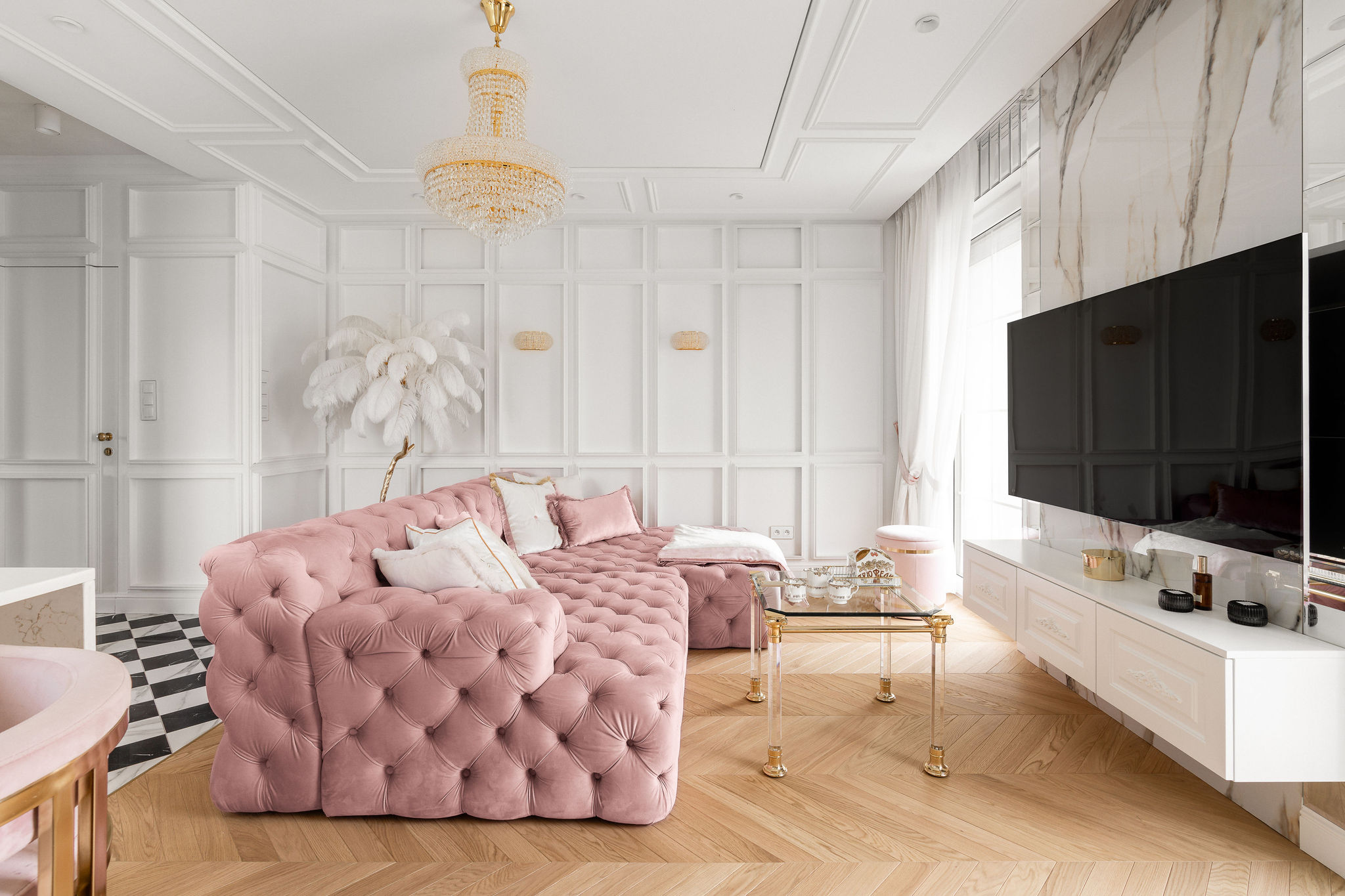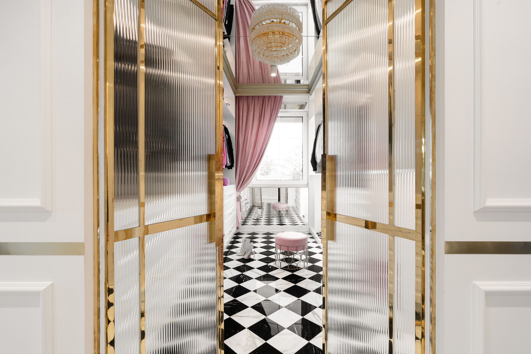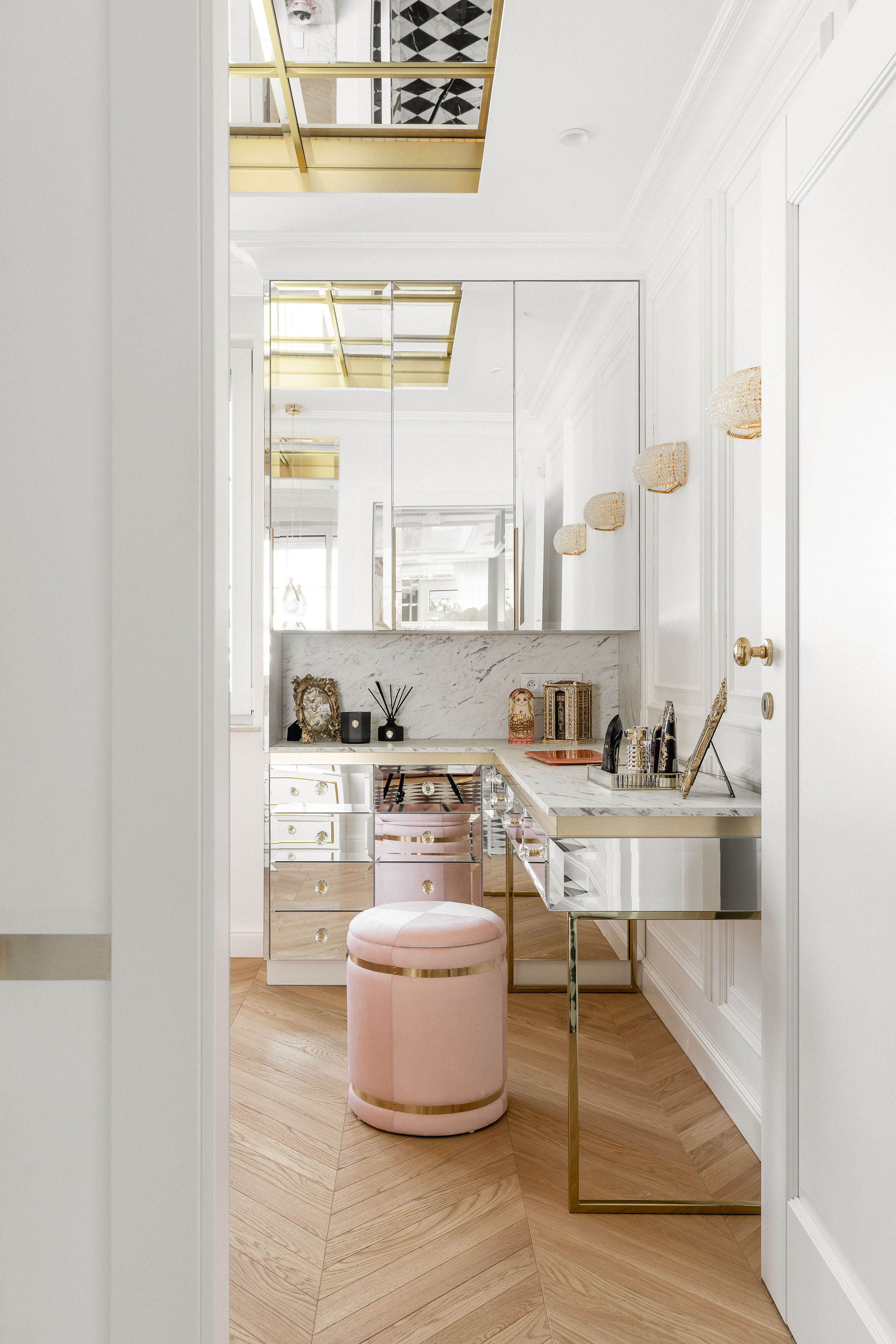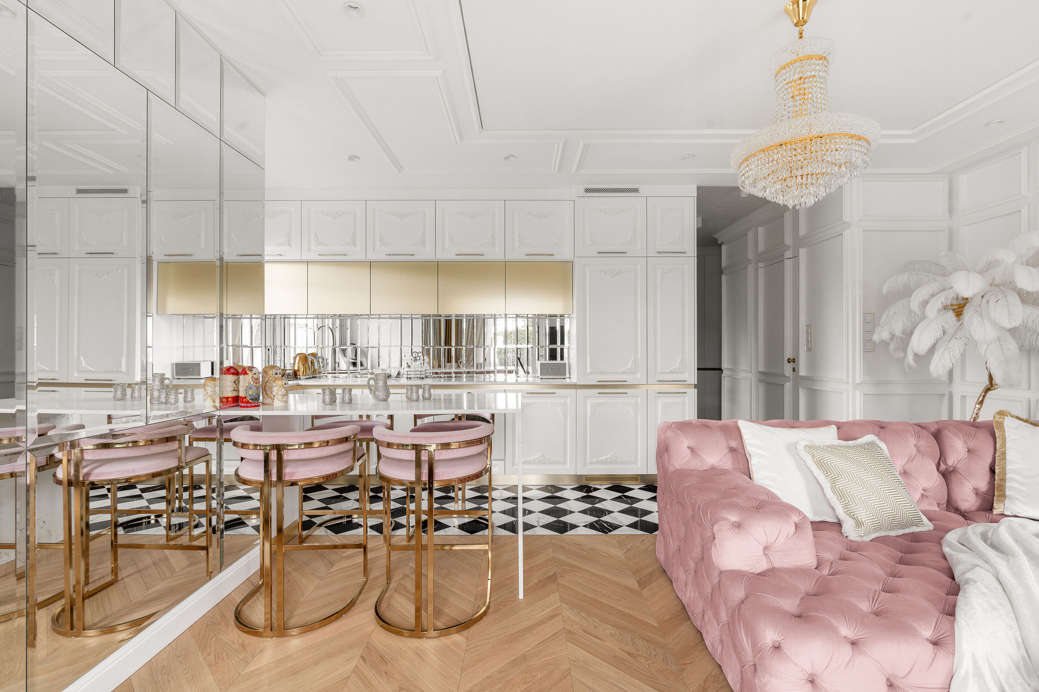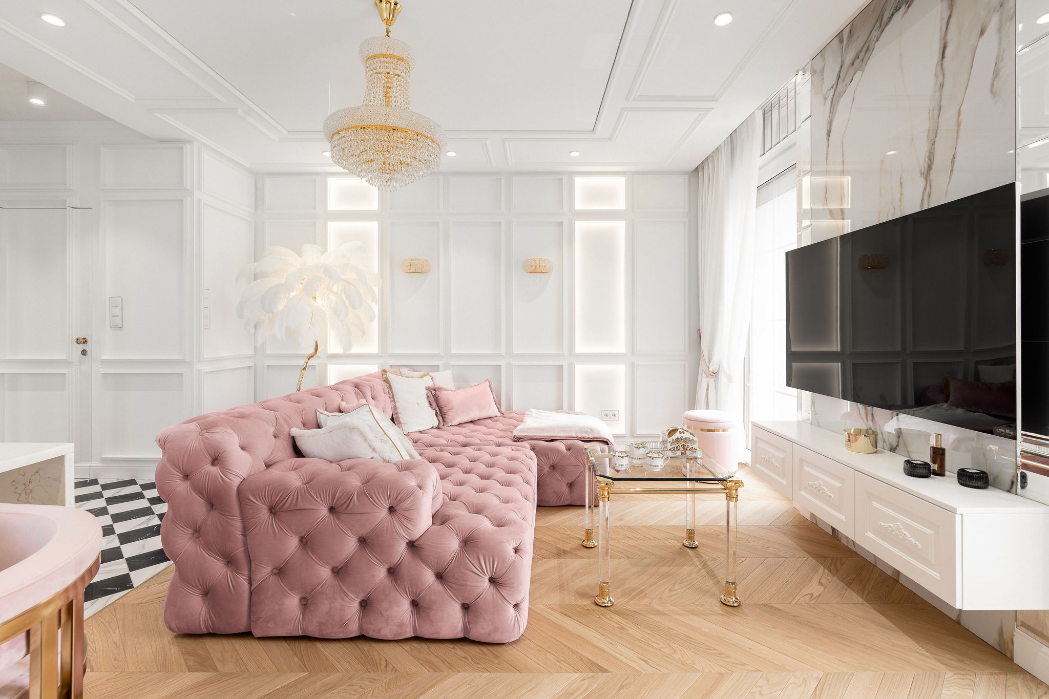 From the beginning the main elements of the project were black and white diamond tiles, powder pink colour, a ton of moulding and crystal chandeliers. To make them more stylish we decided to change the format to 20 x 20 and use marble print tiles. Mirrors and lighting are very important in Zusje's apartment due to her type of work - being an influencer. Every wall is supposed to be photo and video background so there is no boredom in this place!