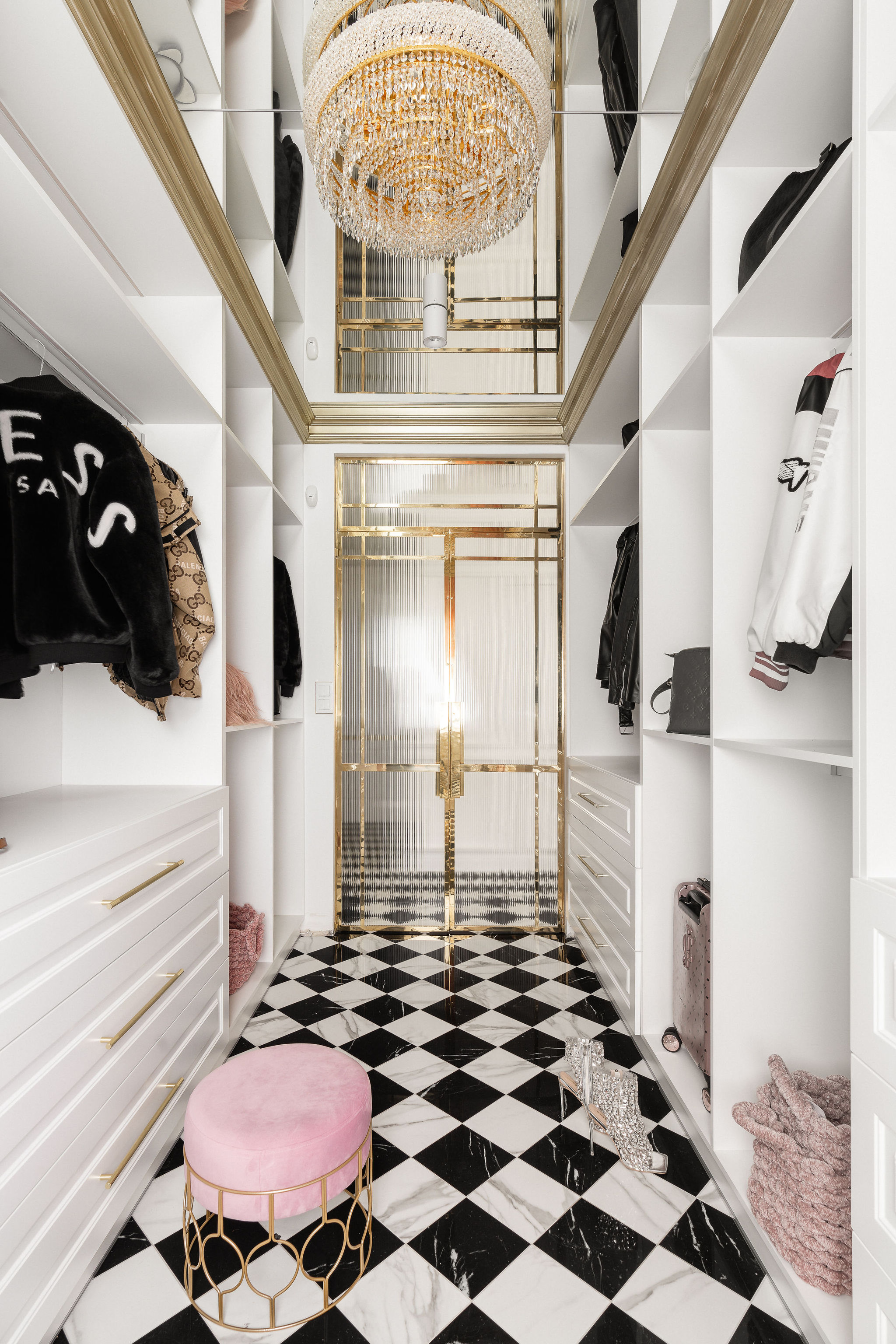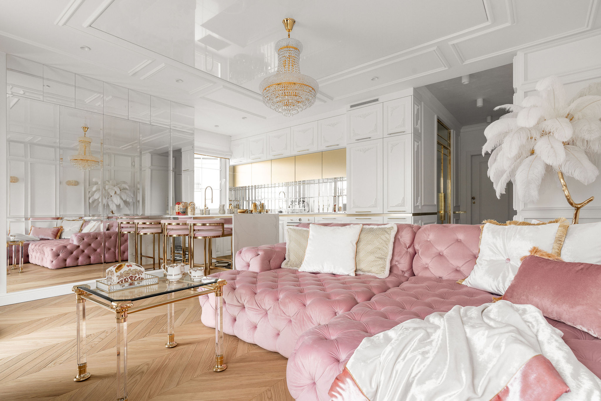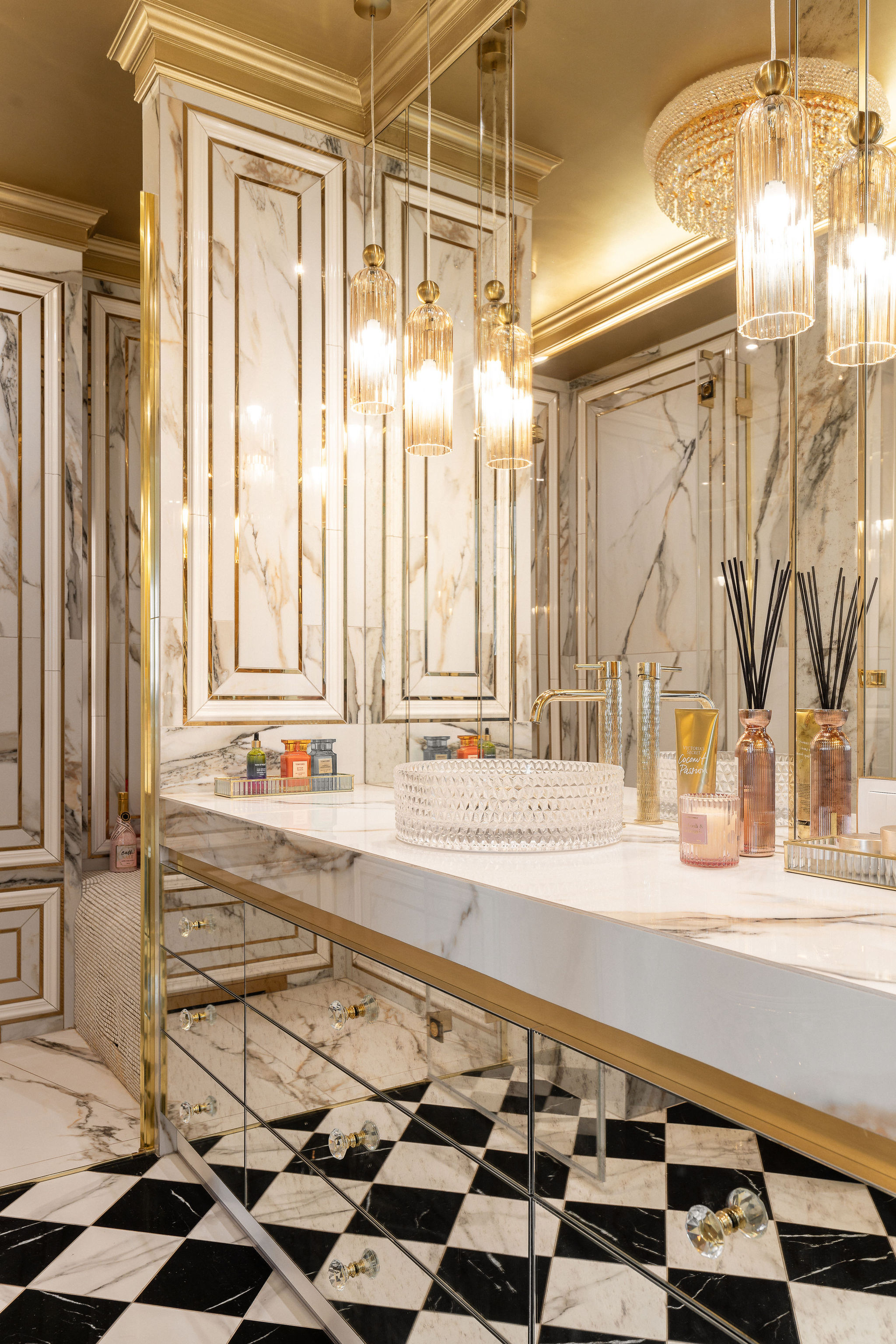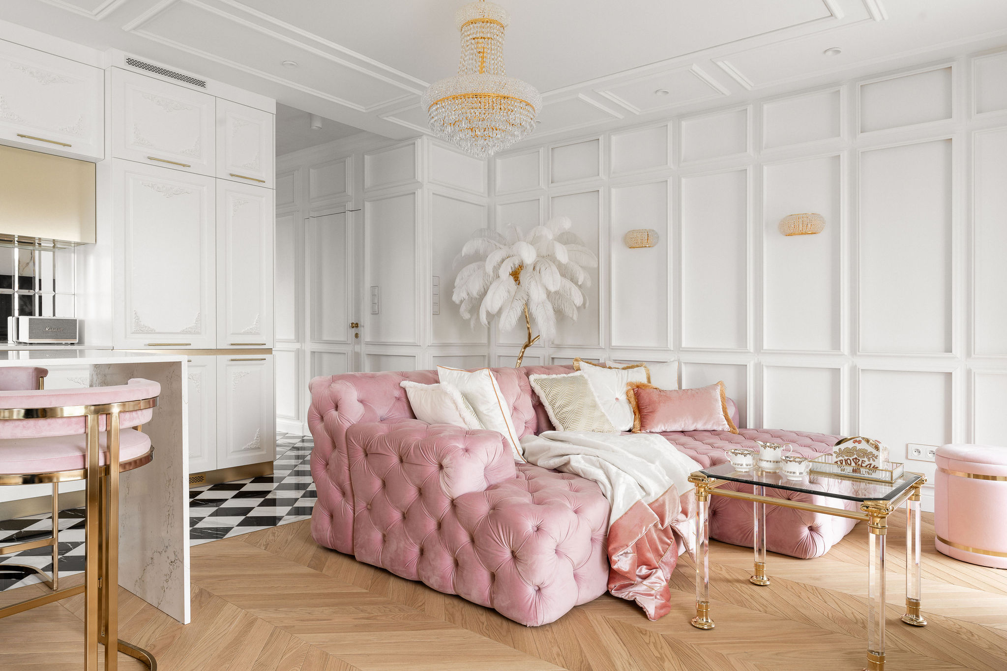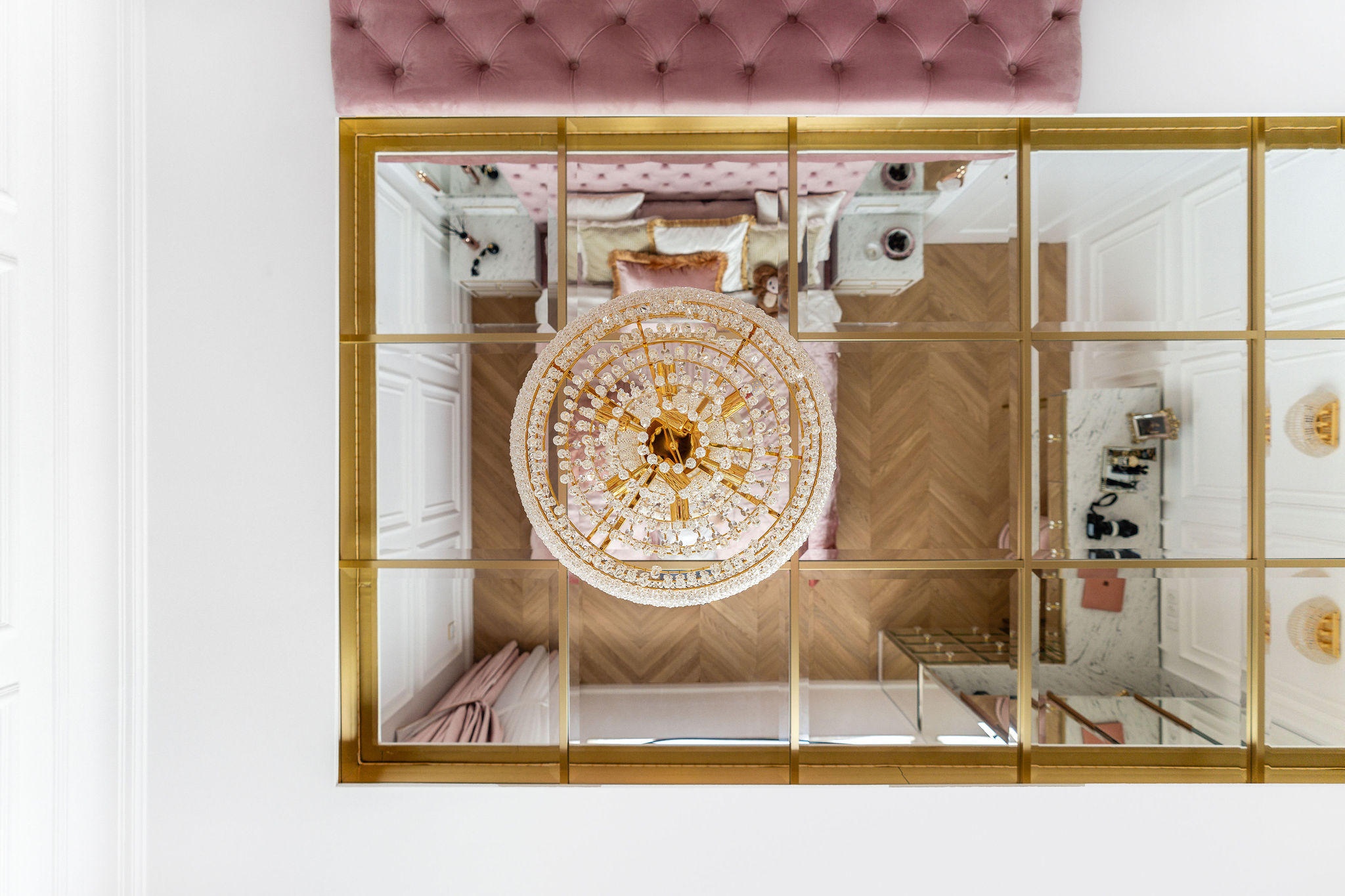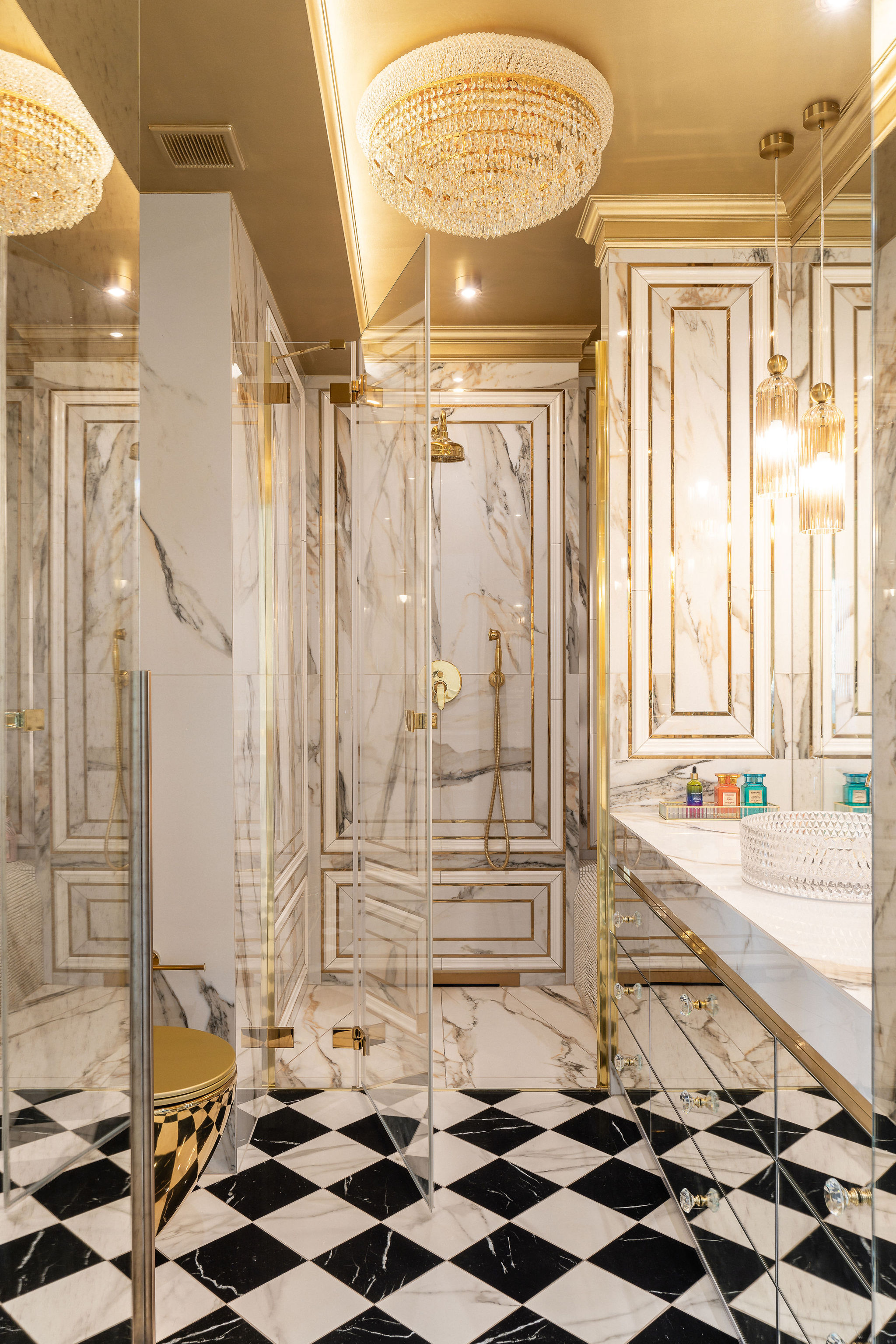 From the beginning the main elements of the project were black and white diamond tiles, powder pink colour, a ton of moulding and crystal chandeliers. To make them more stylish we decided to change the format to 20 x 20 and use marble print tiles. Mirrors and lighting are very important in Zusje's apartment due to her type of work - being an influencer. Every wall is supposed to be photo and video background so there is no boredom in this place!