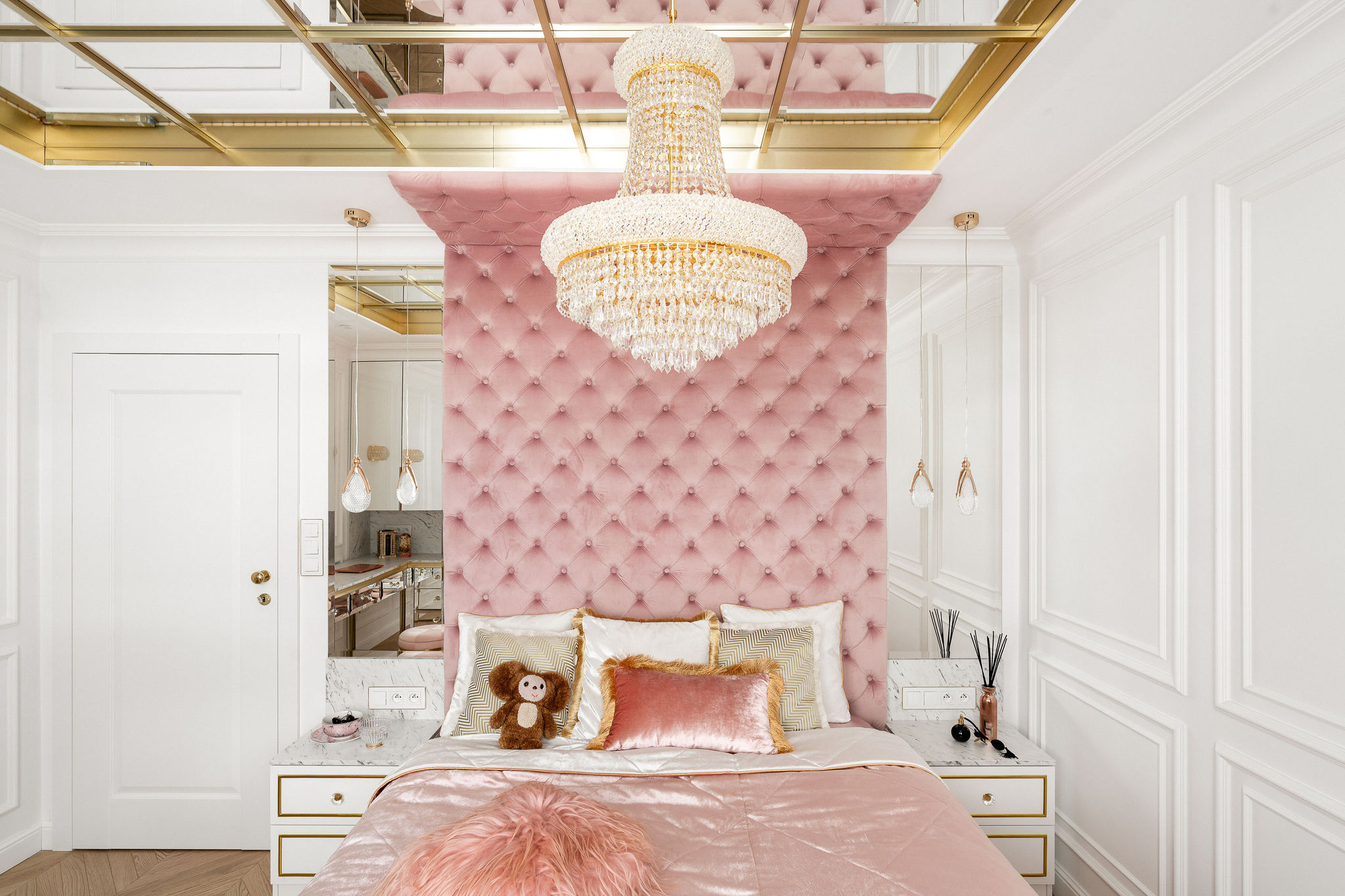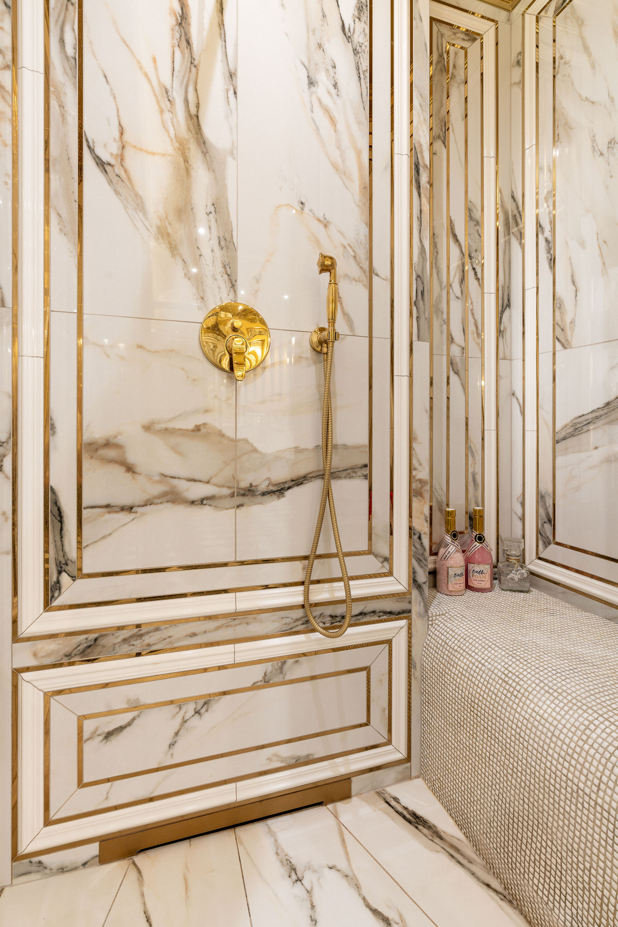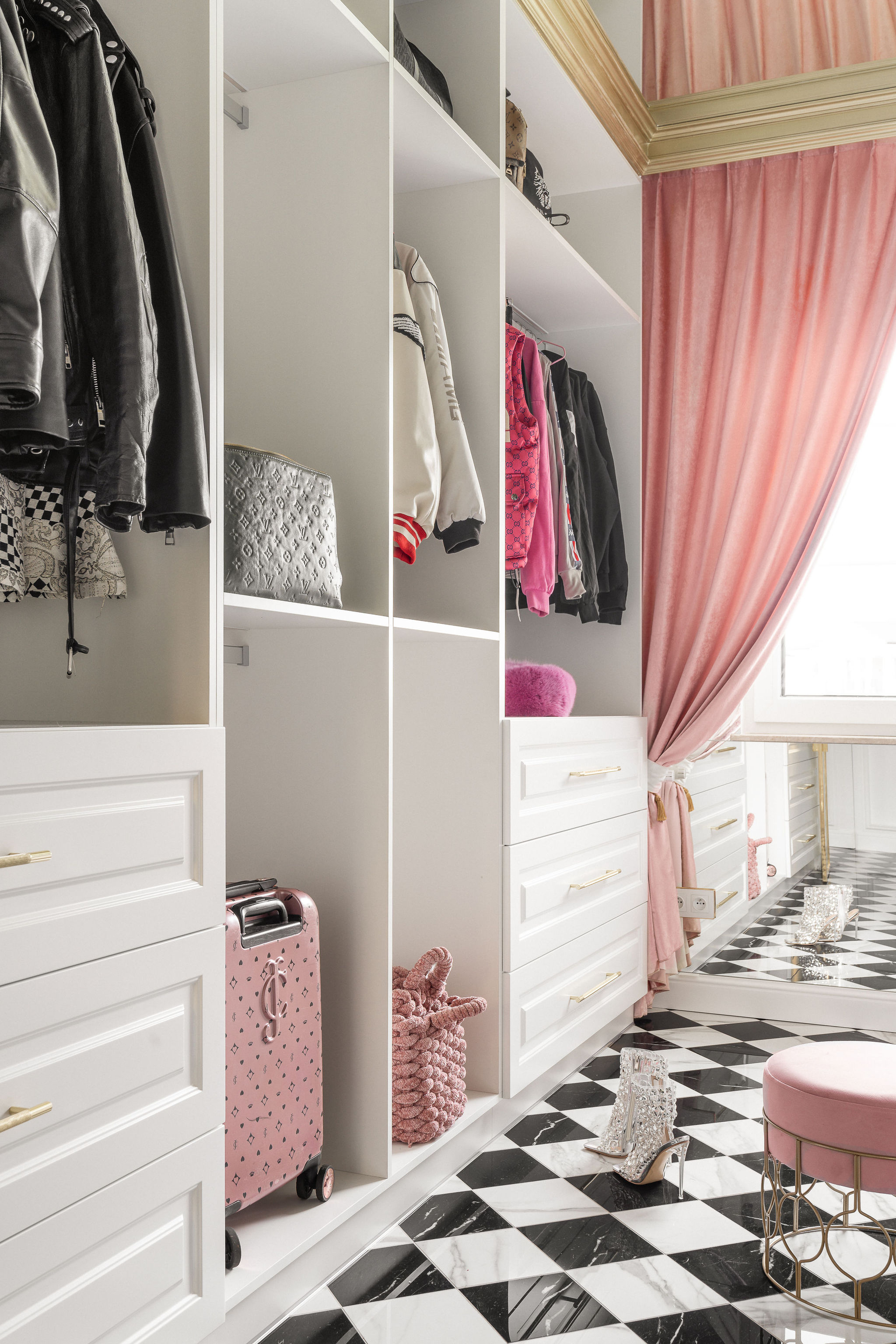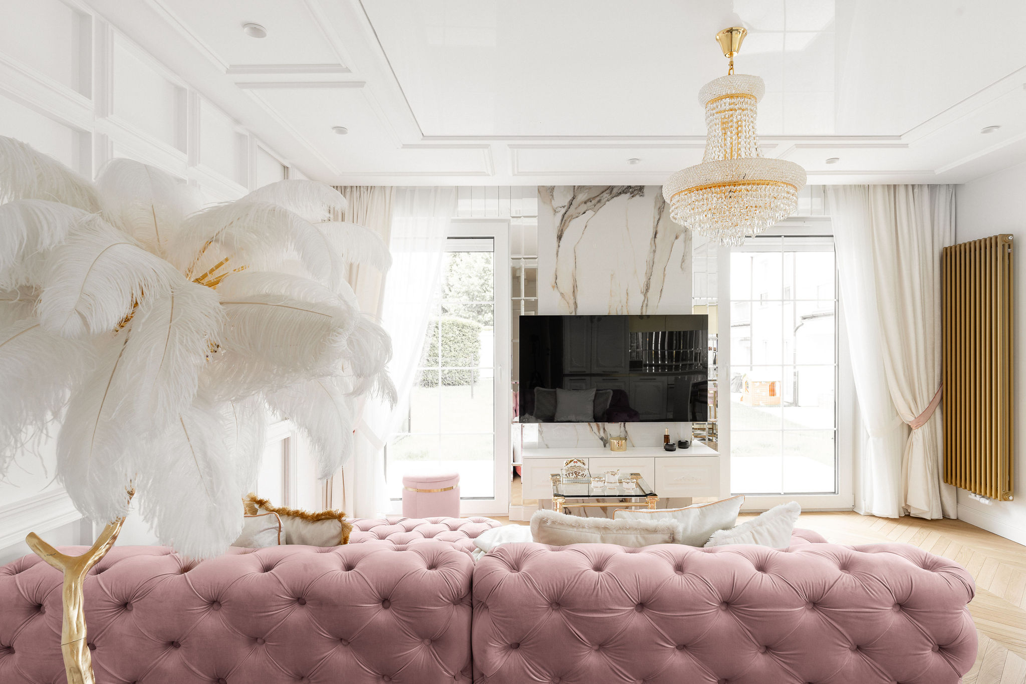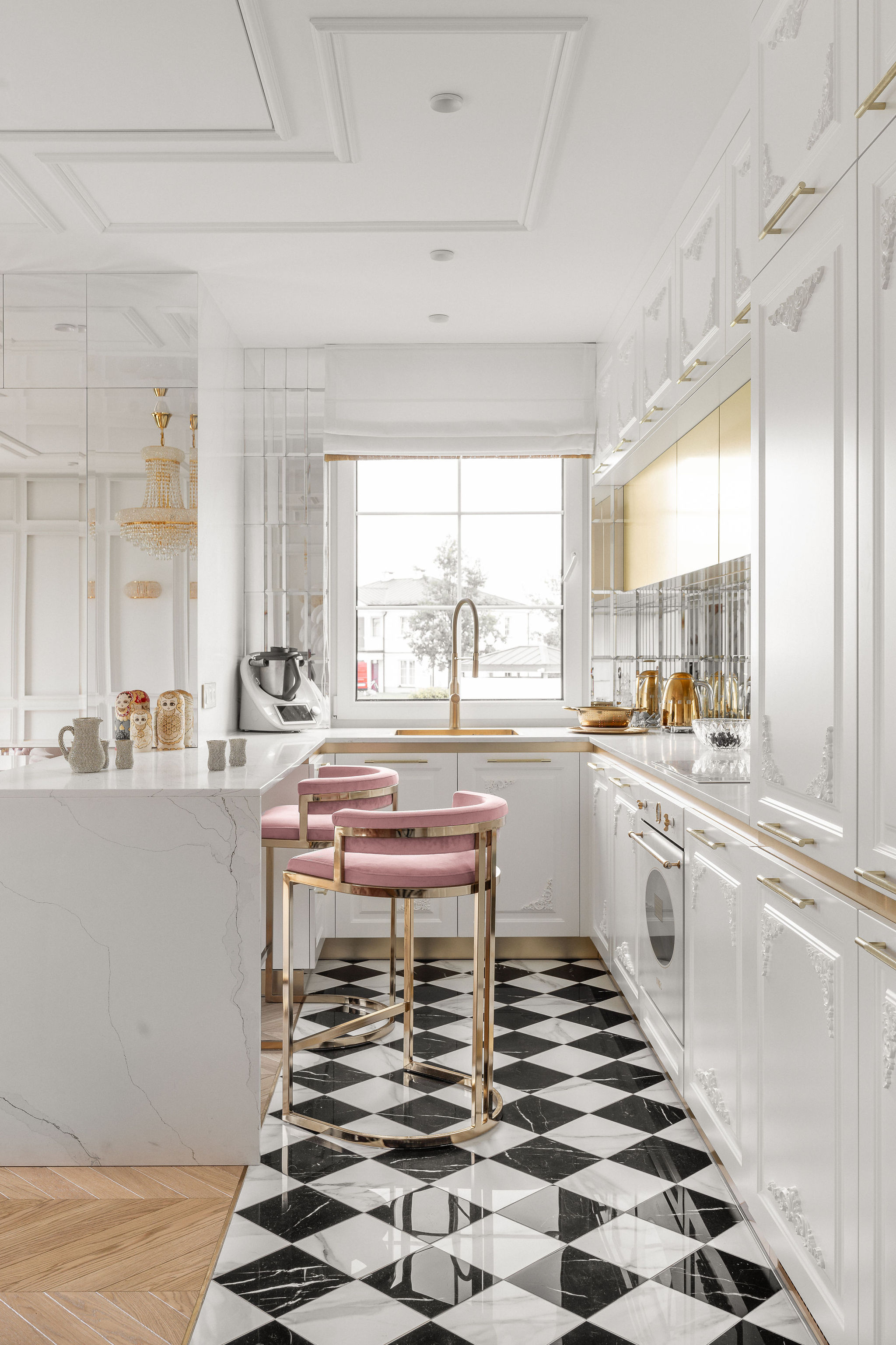 From the beginning the main elements of the project were black and white diamond tiles, powder pink colour, a ton of moulding and crystal chandeliers. To make them more stylish we decided to change the format to 20 x 20 and use marble print tiles. Mirrors and lighting are very important in Zusje's apartment due to her type of work - being an influencer. Every wall is supposed to be photo and video background so there is no boredom in this place!
