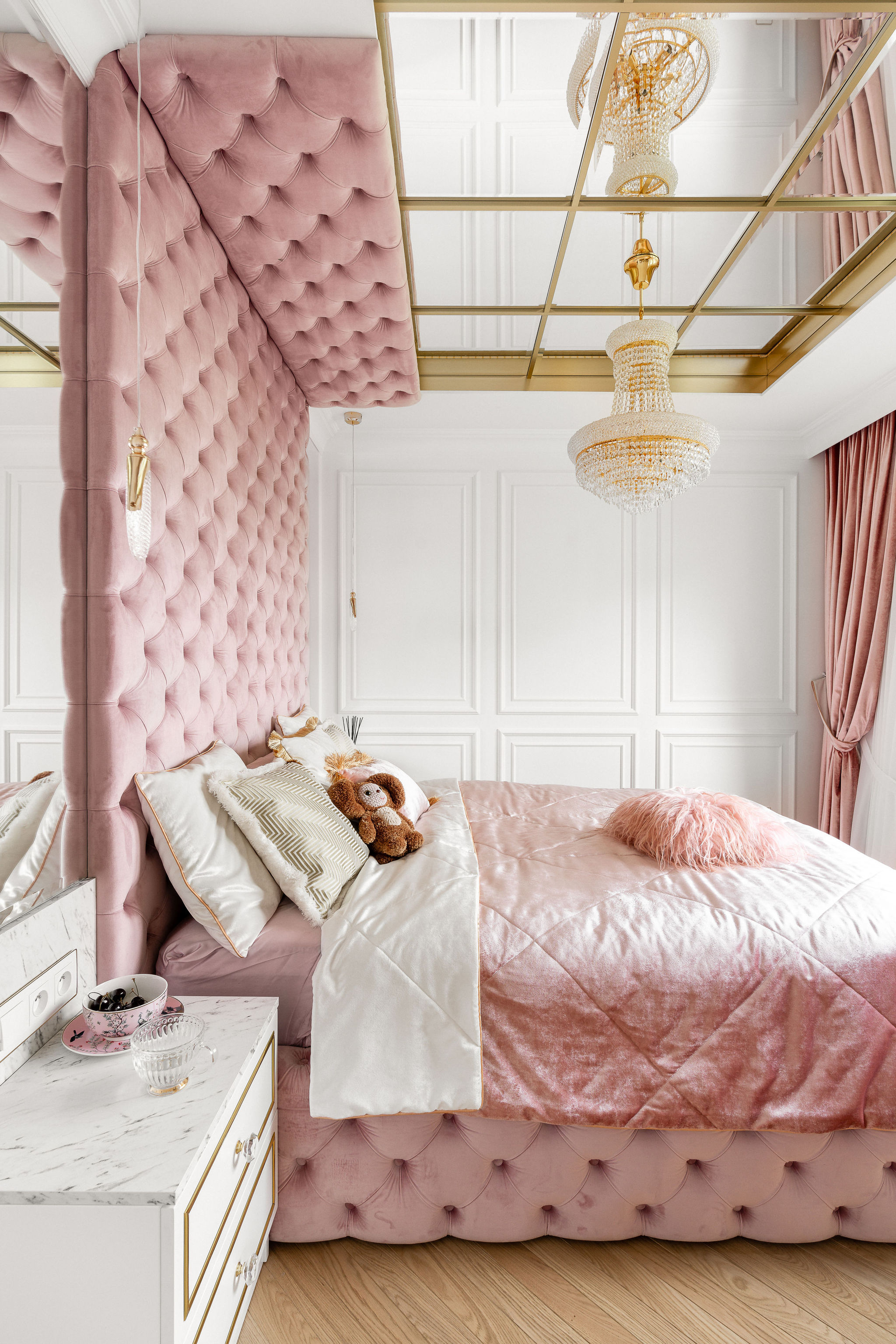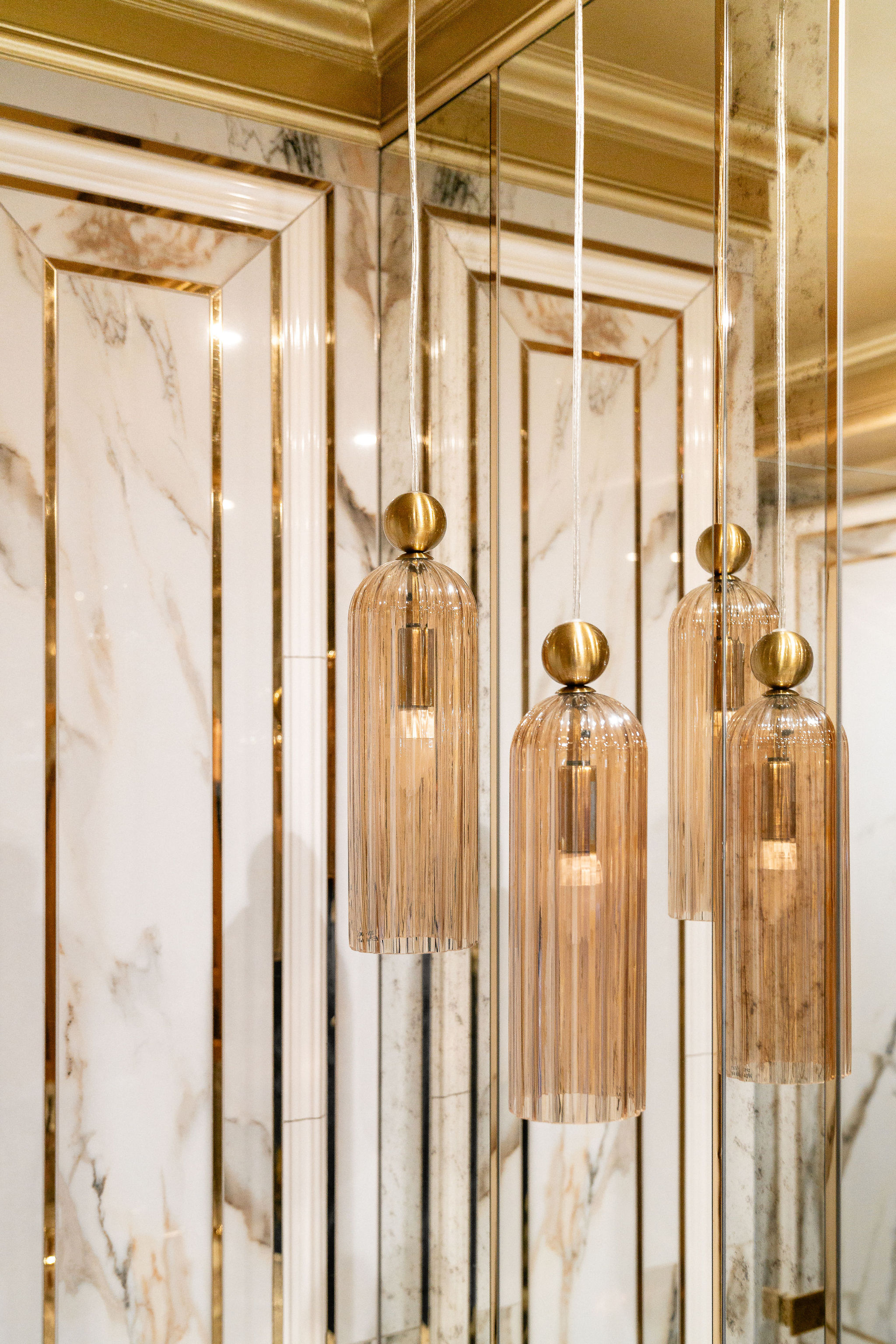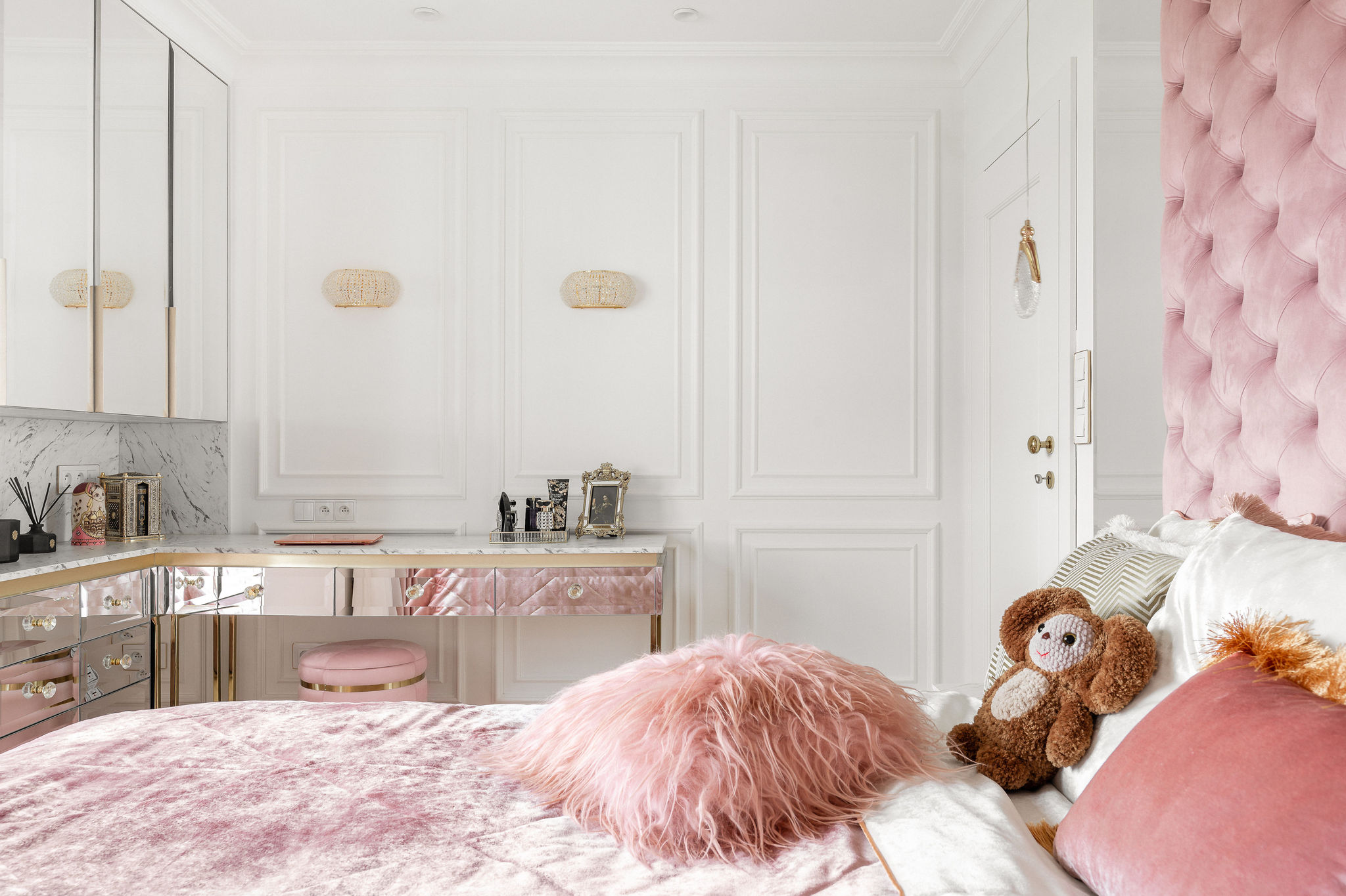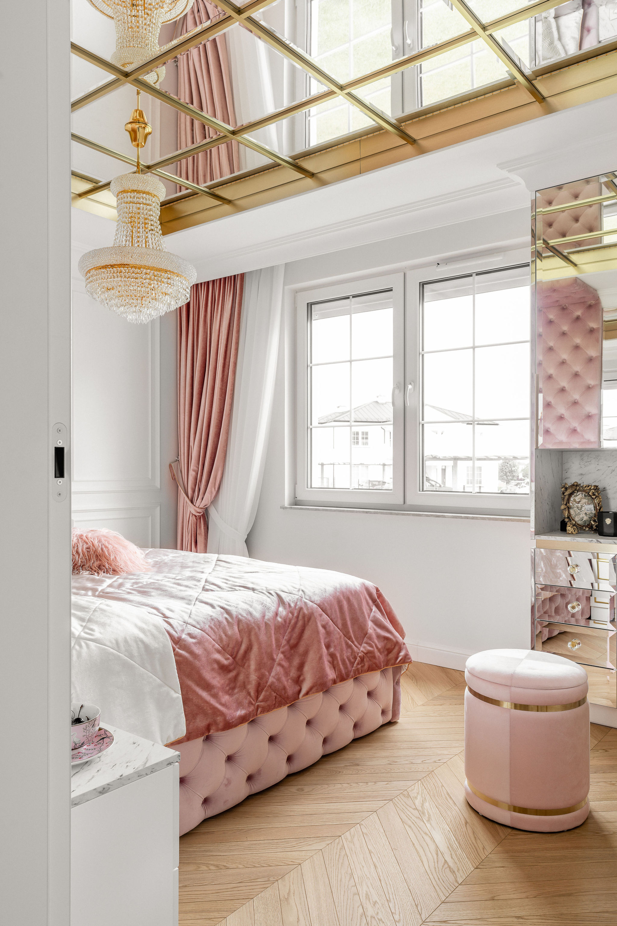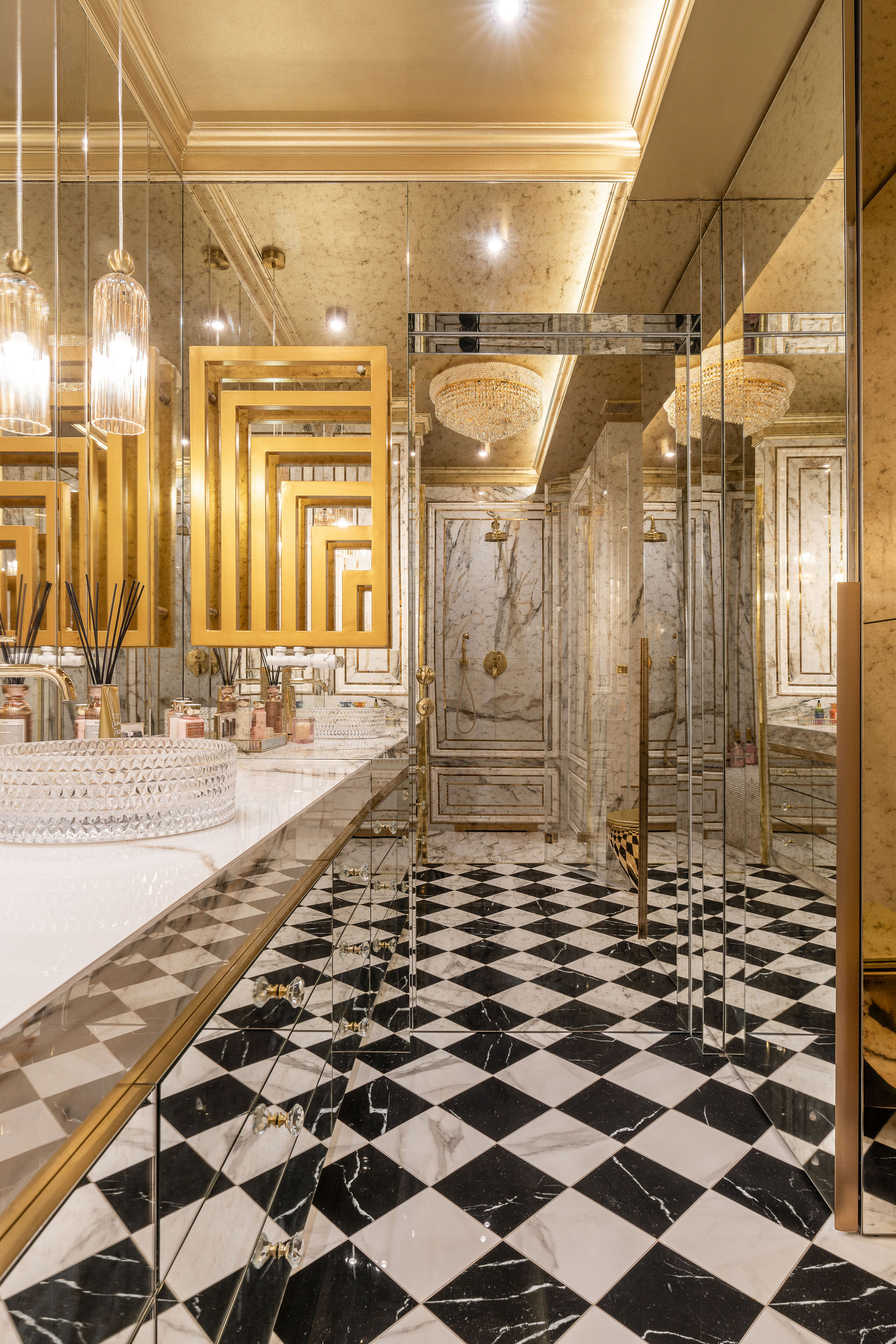 From the beginning the main elements of the project were black and white diamond tiles, powder pink colour, a ton of moulding and crystal chandeliers. To make them more stylish we decided to change the format to 20 x 20 and use marble print tiles. Mirrors and lighting are very important in Zusje's apartment due to her type of work - being an influencer. Every wall is supposed to be photo and video background so there is no boredom in this place!